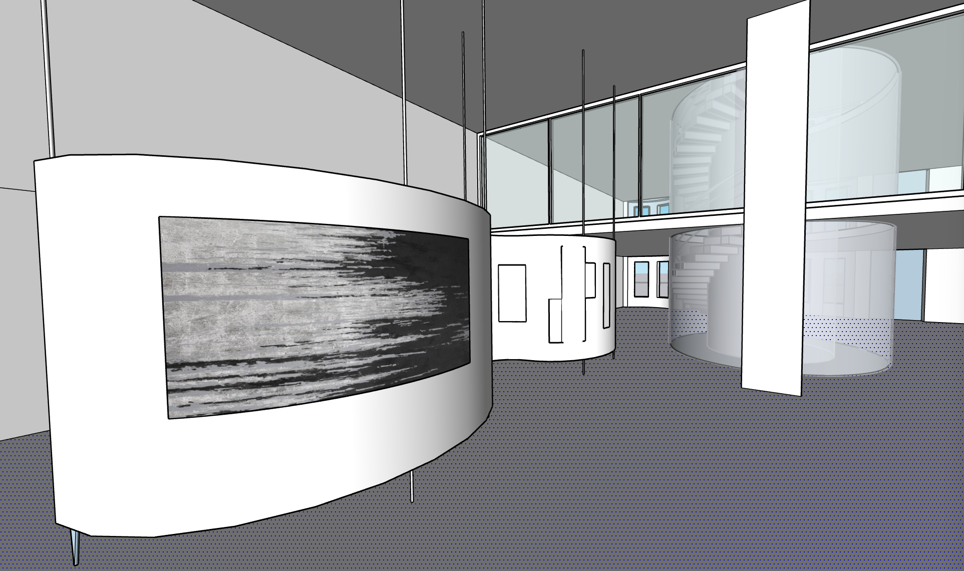 render a modern art gallerie with lets colors and a lush round staircase with different levels and some display of art architecture