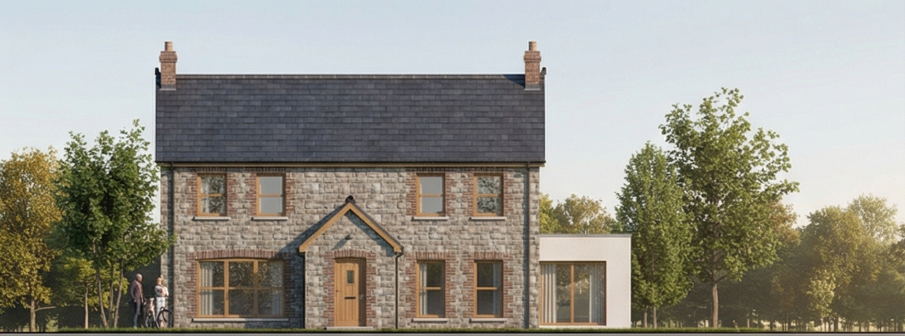 stone house with lower building set back