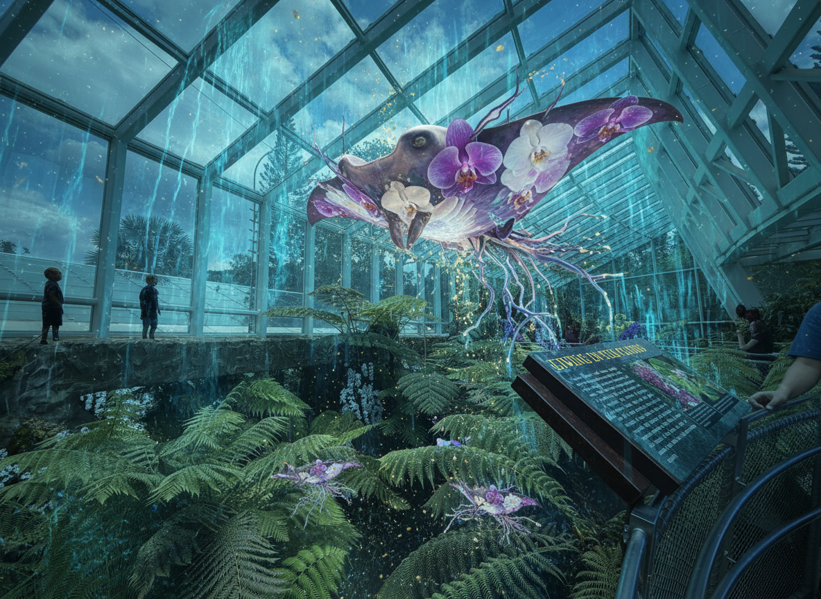 a render of a night installation at the singapore national orchid gardens water effects illuminate the space a hybrid creature made out of an abstract manta ray that has orchid like features float across the airspace the creature spreads pollen around the space that looks like fireflies people watch from the sides