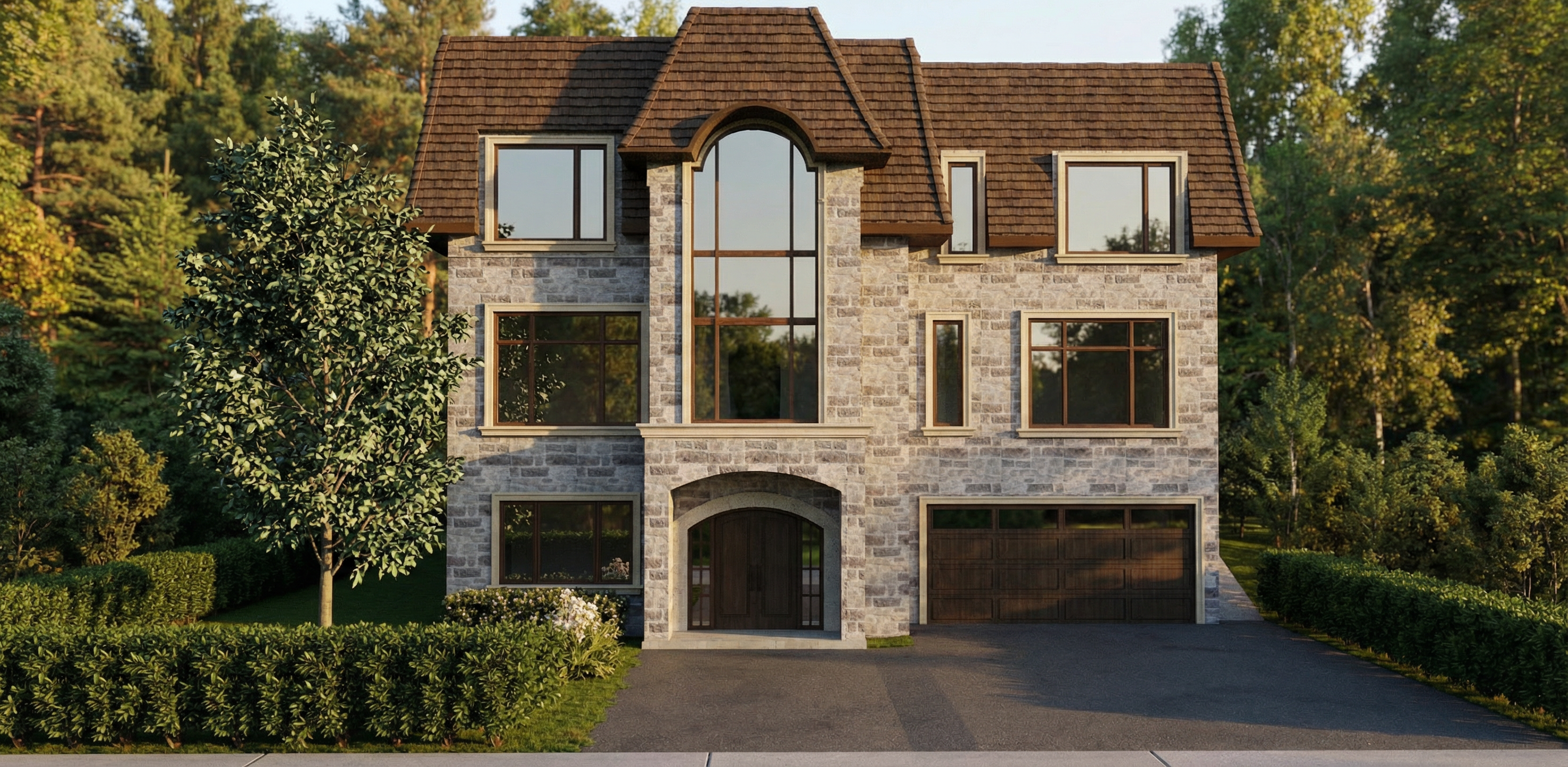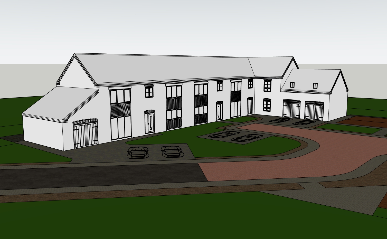 create uk brick style barn conversion with light grey windows driveways to front of house with cars on drive landscaping to the surrounding areas blue sky light cloud summer afternoon with natural ambiant lighting