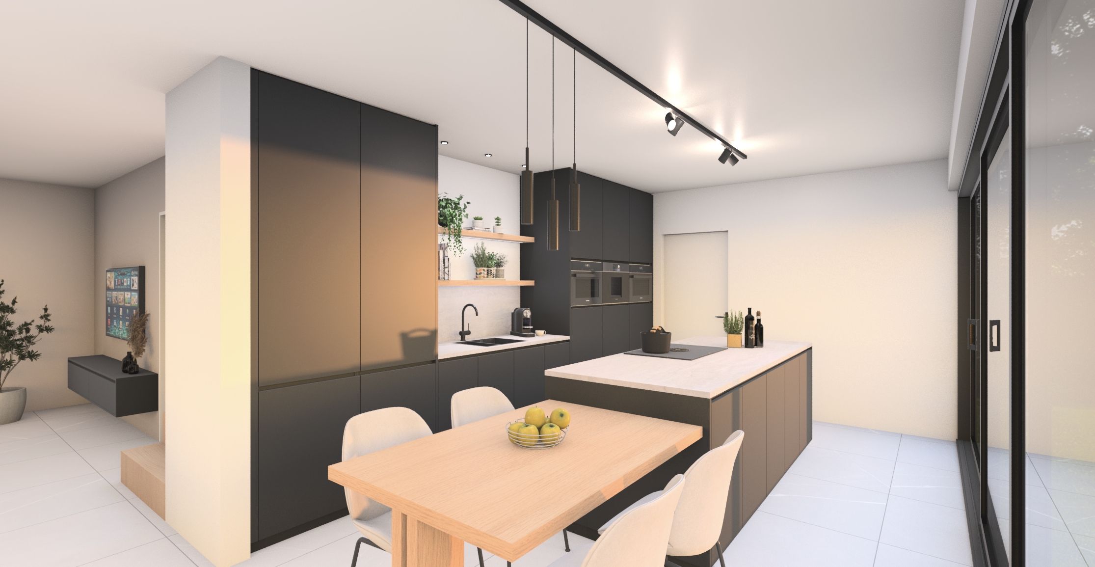 enhance this photo of a kitchen into a professional interior image optimize the lighting so the space appears bright natural and inviting with soft realistic light entry and balanced shadows subtly increase sharpness and clarity correct white balance and colors so that materials such as wood stone metal and lacquer appear true to life and luxurious ensure the overall look is sleek stylish and high end without changing the layout furniture or architecture maintain a realistic appearance refine contrast and details reduce noise and give the photo a warm elegant interior style like in a premium kitchen catalog
