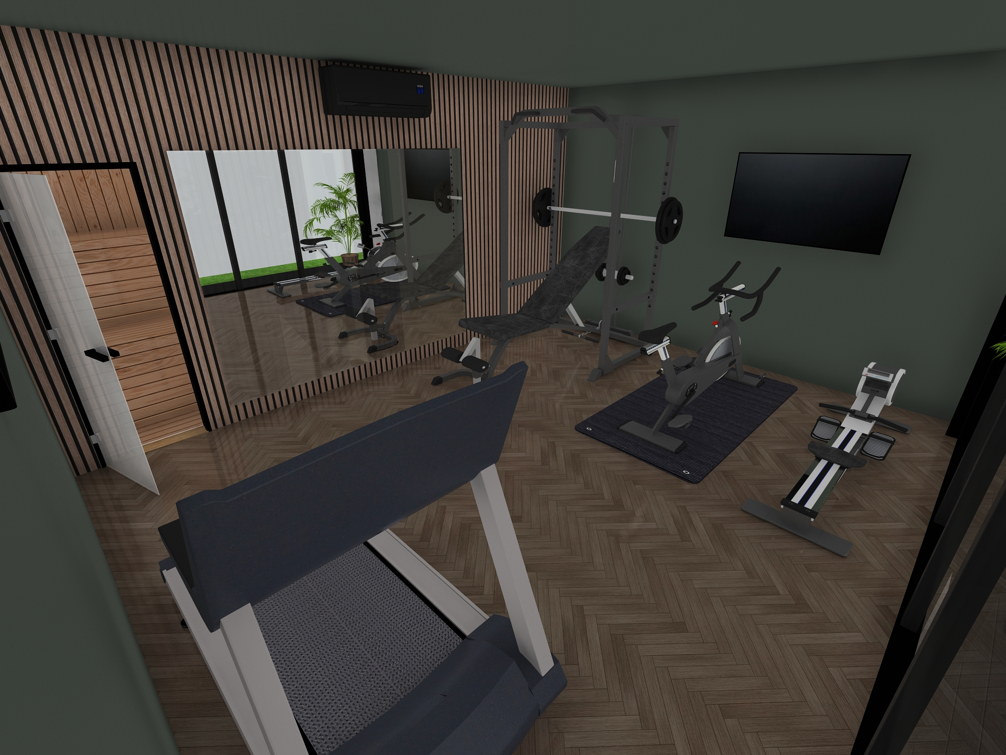 outdoor home gym with a modern design composed of a black ribbed exterior structure the interior gym equipment includes a treadmill and exercise bike visible through large glass doors the walls inside are painted in a light soft gray and the flooring is a warm polished wood on the right a potted palm plant adds lush greenery contrasting with the indoor setting the surrounding grass is vibrant green giving a fresh natural feel the atmosphere is calm and inviting with natural light filtering through the glass highlighting the sleek contemporary design