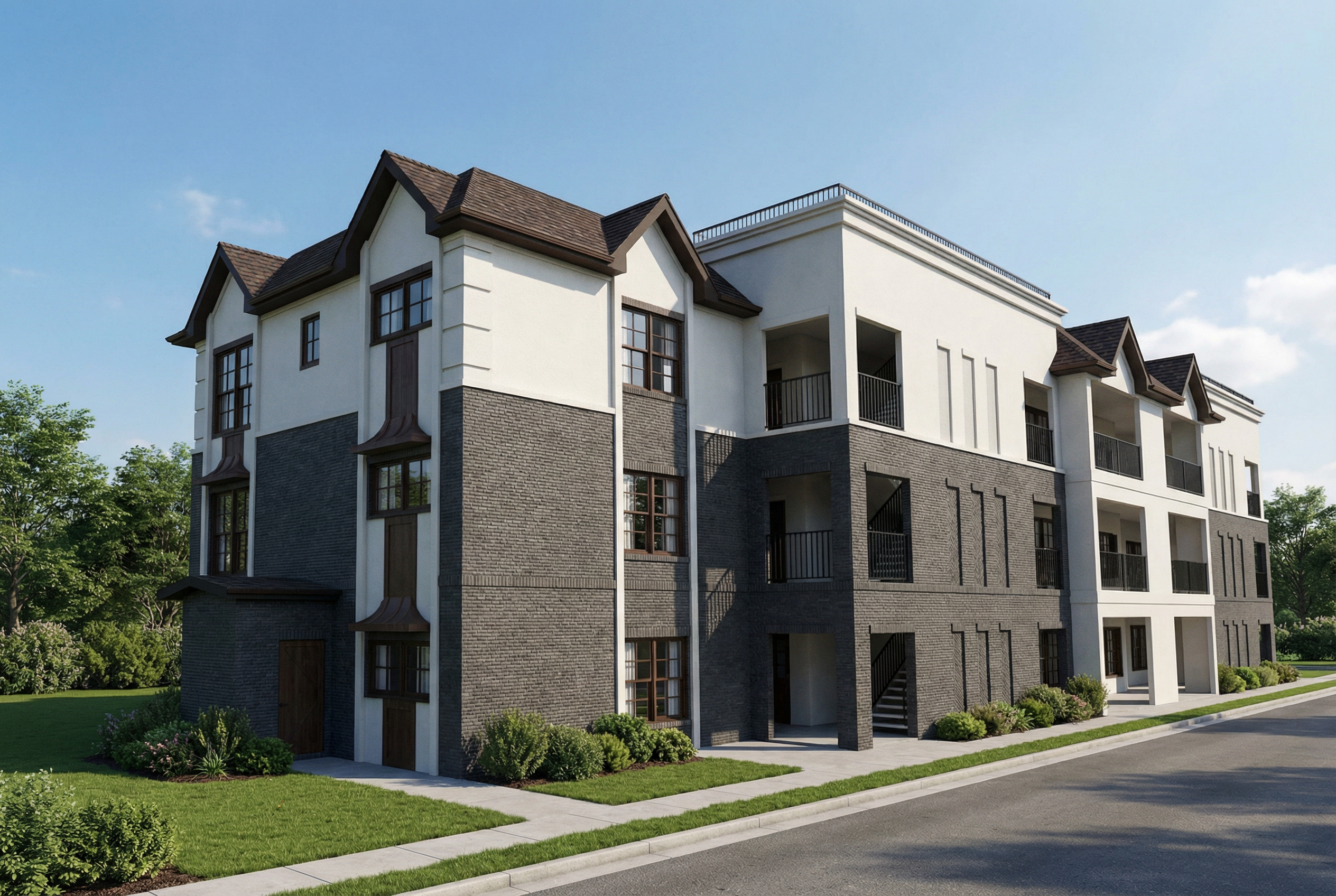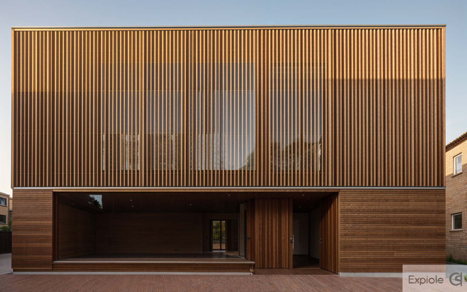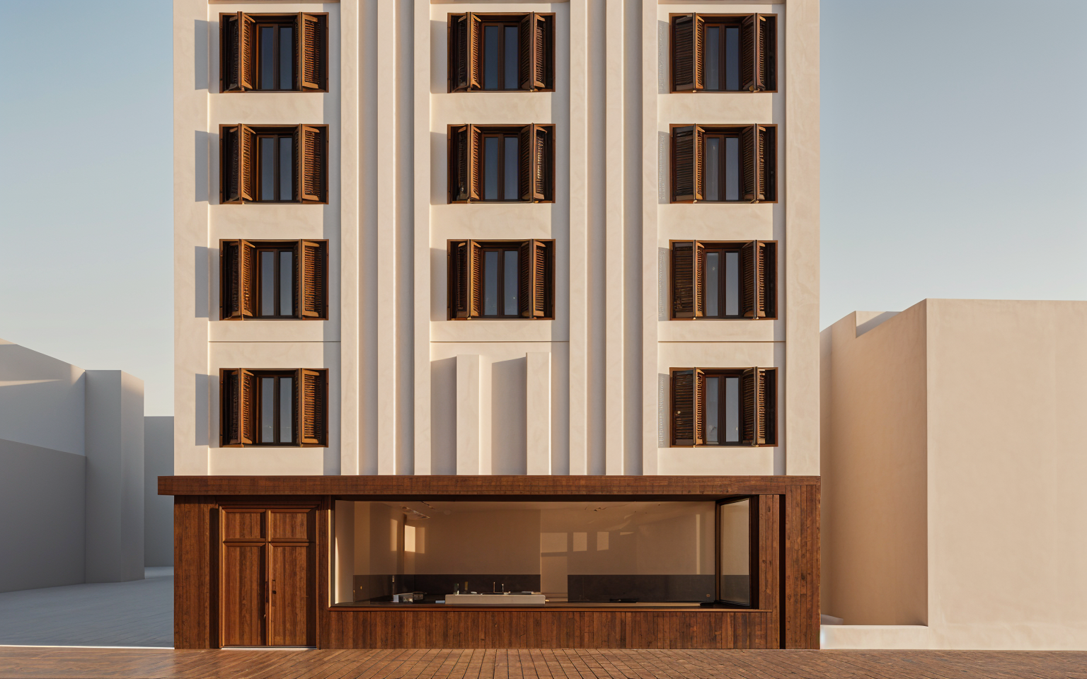 use warm colours make it look more realistic add a large medium size window to main floor and make the wood on the upper part of the building more of a deep brown colour make thw main level a burnt orange colour 6 floors total