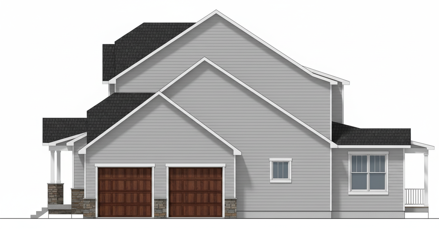 keep colors planting under each front windows paver walk way straight to front door paver sloped driveway to garage boulder wall under front right window side leveling off front right of home white fence to back yard sunny suburban nj summer background