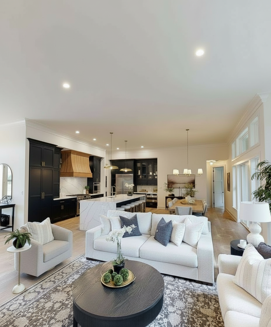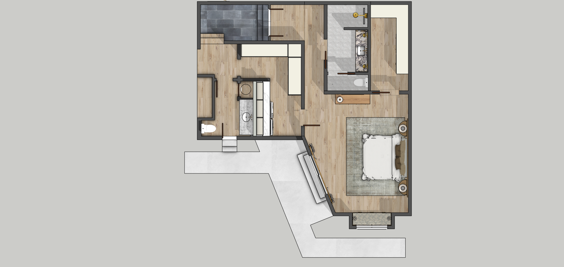 modernist interior from the top high quality top down architectural floor plan rendering enhance the existing 2d plan with realistic materials soft shadows and depth while preserving the exact layout walls room sizes and furniture placement wood flooring should have natural grain and variation tile and stone areas should read clearly and cleanly furniture should feel dimensional and styled but remain consistent with the original plan add subtle shadows highlights and ambient lighting for clarity and hierarchy include soft greenery in outdoor or courtyard areas where shown overall look should be polished warm and presentation ready similar to a professionally rendered floor plan do not redesign or alter the plan architecture