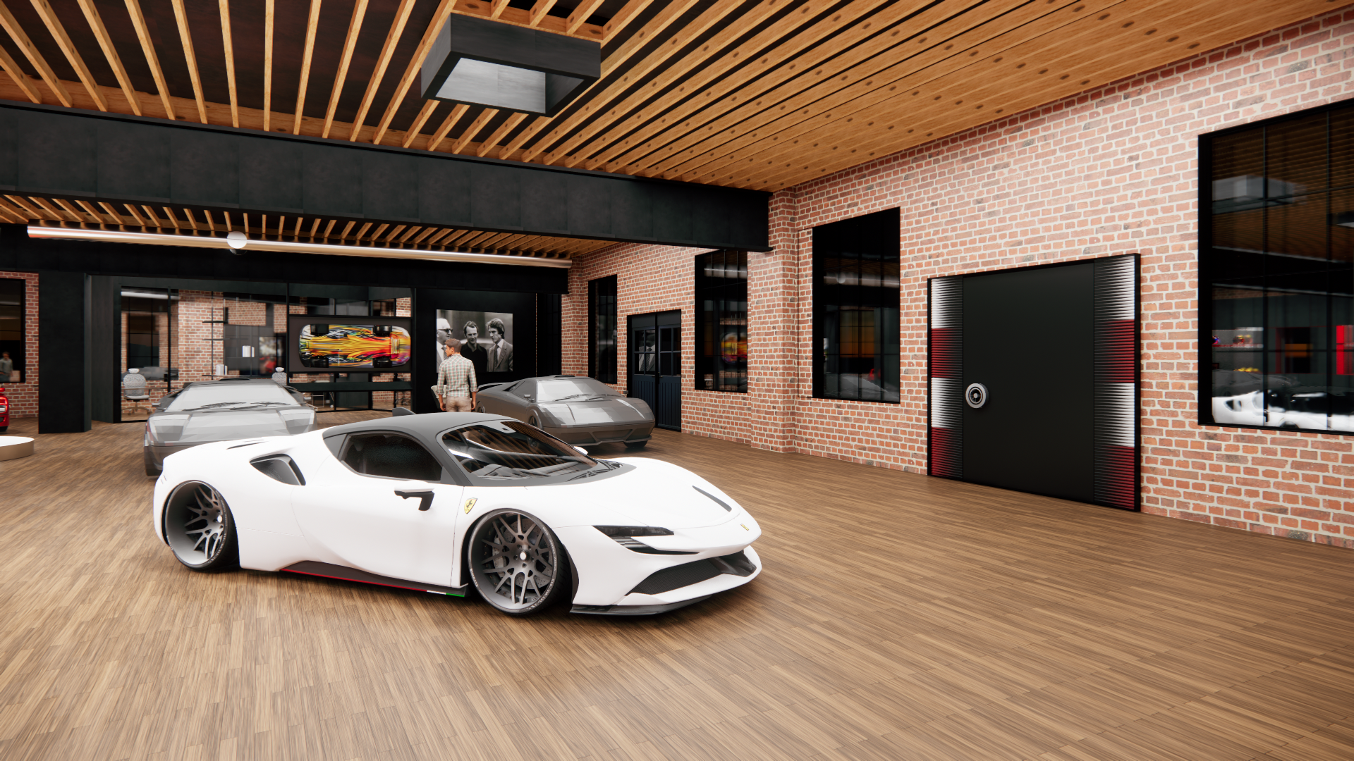 ultra realistic luxury automotive showroom interior warm natural wood ceiling with exposed beams matte black steel structure red brick walls matte walnut wood flooring nighttime with large industrial windows soft illumination no lights visible center focus futuristic performance garage door with bold red and white race track inspired side borders high end blackened steel door with noticeable seam lines between door and red and white borders sleek and aggressive motorsport aesthetic shiny chrome car wheel door pull on the polished black entrance door foreground pristine white hypercar with detailed reflections sharp body lines low stance studio quality reflections on paint and glass background includes additional exotic cars glass partitions and a refined lounge workspace area photorealistic materials ray traced reflections global illumination soft shadows ambient occlusion depth of field high dynamic range 8k detail architectural visualization style ultra clean minimal clutter premium design