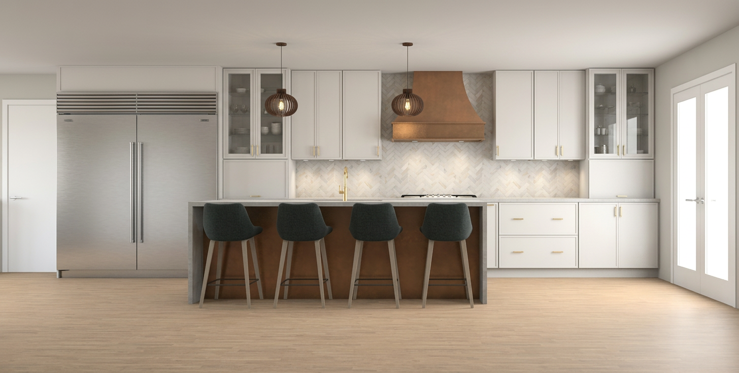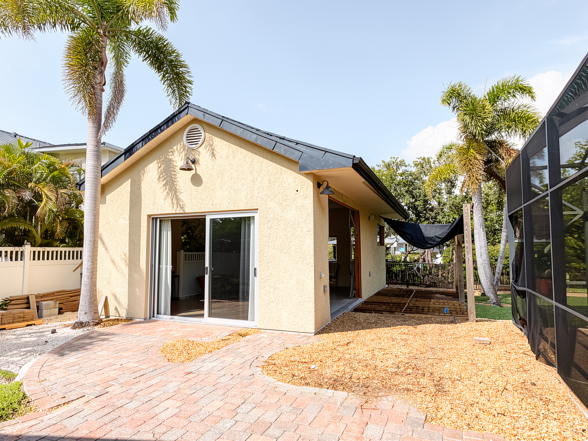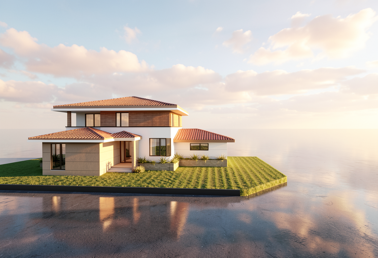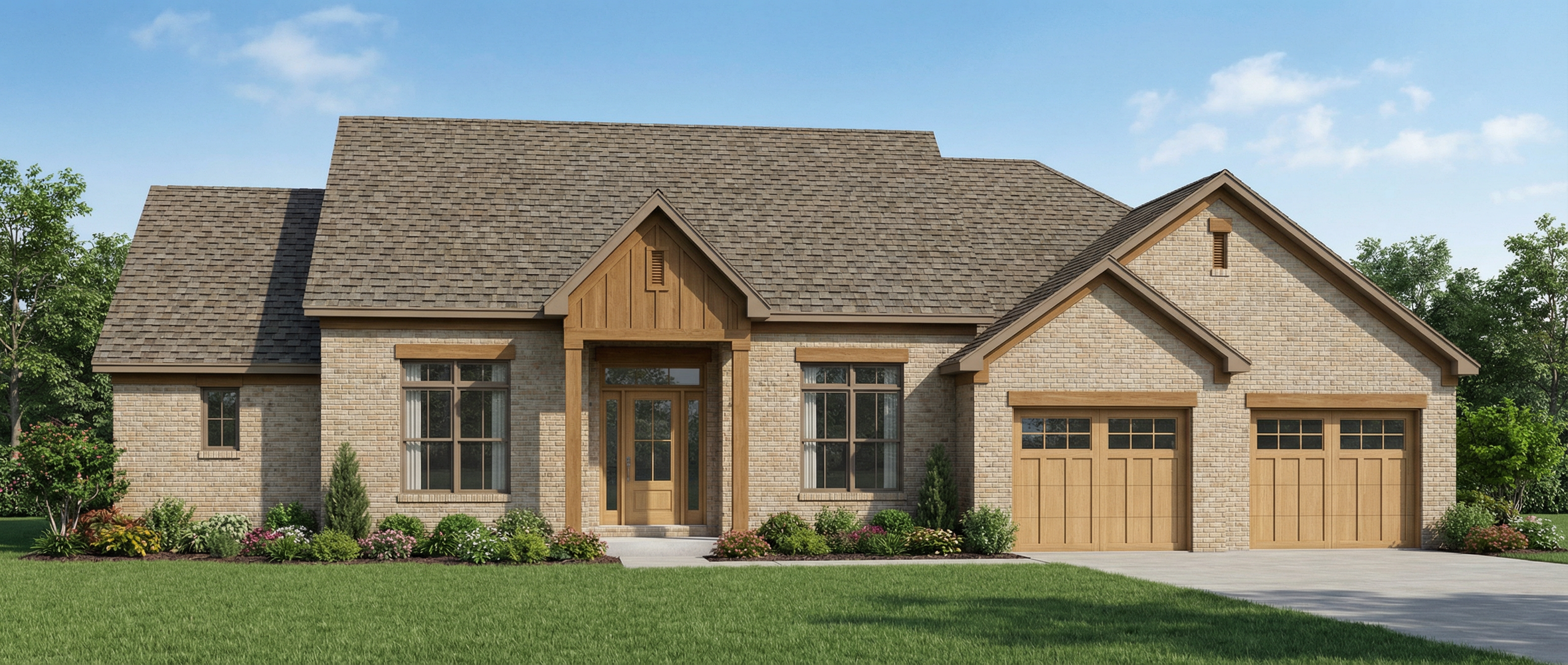 render this elevation realistic in a setting with some light landscaping in a residential neighborhood the windows and doors should be black the brick should be a natural color and stucco should be in a light modern color