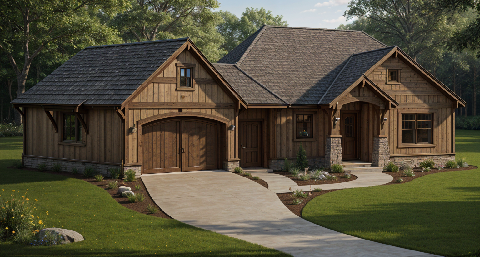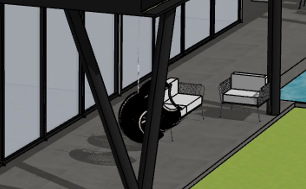 modern outdoor patio with large glass windows reflecting the soft evening light black and white minimalist furniture arranged neatly including 2 sleek swings suspended from a dark industrial beam the ground is paved with smooth basaltine tiles to the right a vibrant green lawn contrasts with a shimmering light blue pool creating a tranquil serene atmosphere the overall scene is bathed in a warm golden sunset glow enhancing the elegant and relaxing ambiance