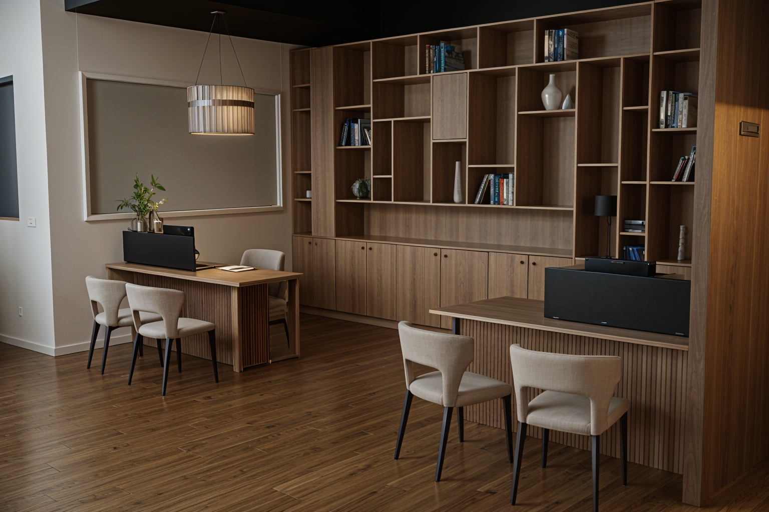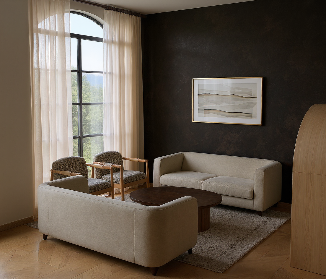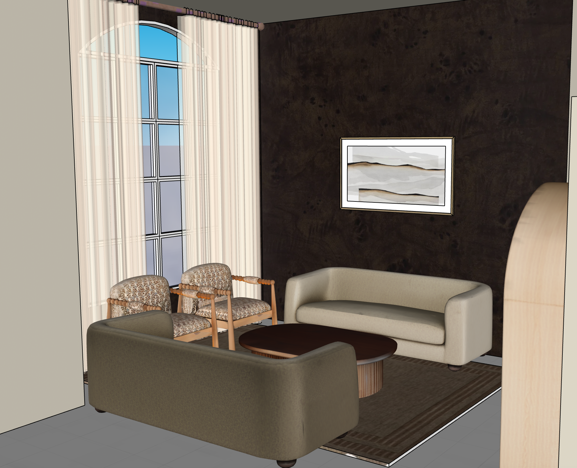 floors are white matte large tiles and extra large chocolate brown rug with the edges scalloped