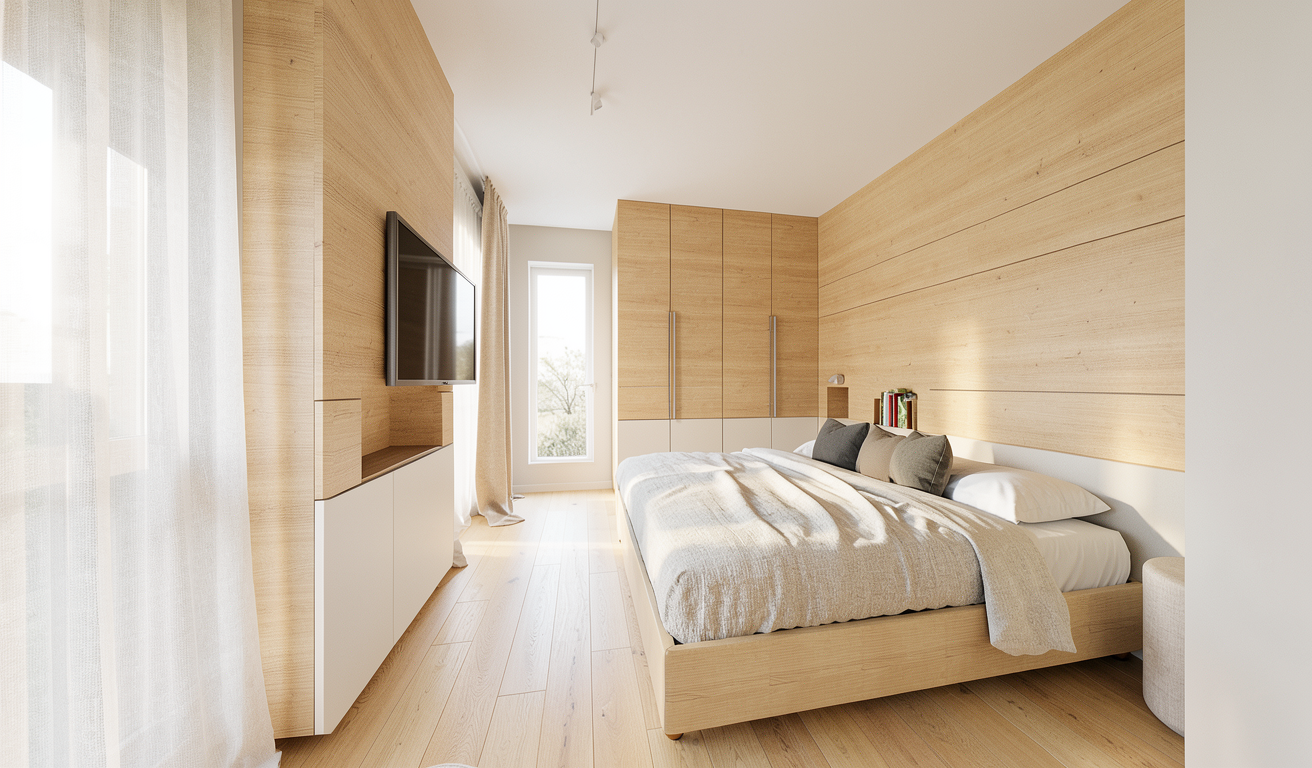 pavimento in parquet rovere chiaro arredi in rovere chiaro tessuti chiari bianco e beige specchio a filo lucido di fianco all armadio in fondo strip led nella nicchia tv e sopra testata letto