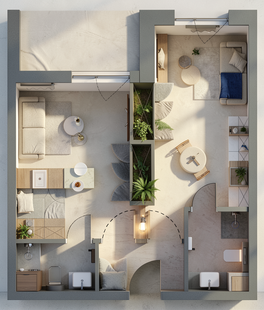 convert this floor plan into a modern isometric 3d view of a full house show the space from an elevated angle with furniture walls and details visible use the same furniture as shows on the plan do not change the orientation of the floorplan