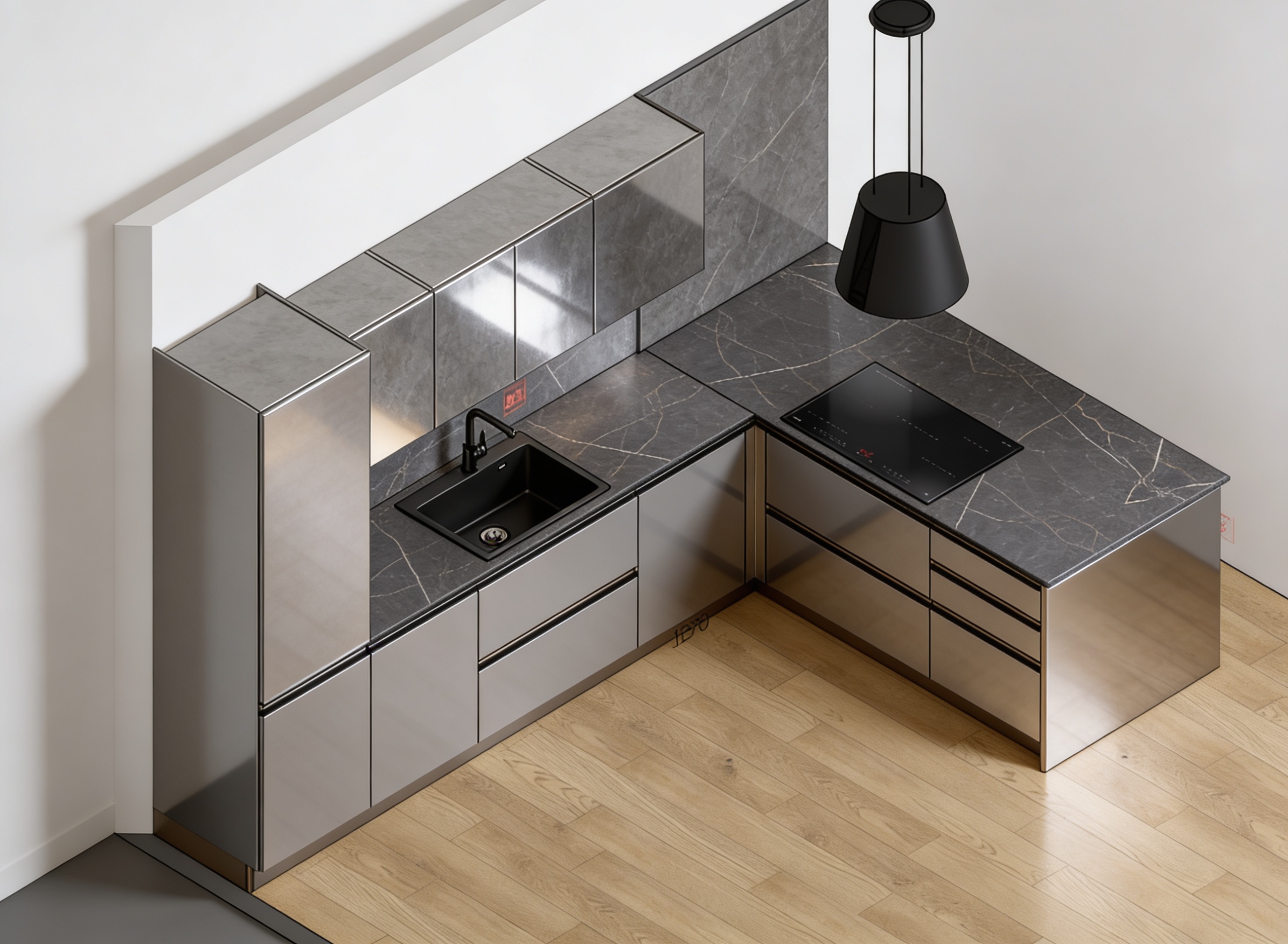 mi puoi renderizzare questa scena rendendola in stile caldo con superfici laccate e riflettenti con colori uniformi per i pensili e la colonna