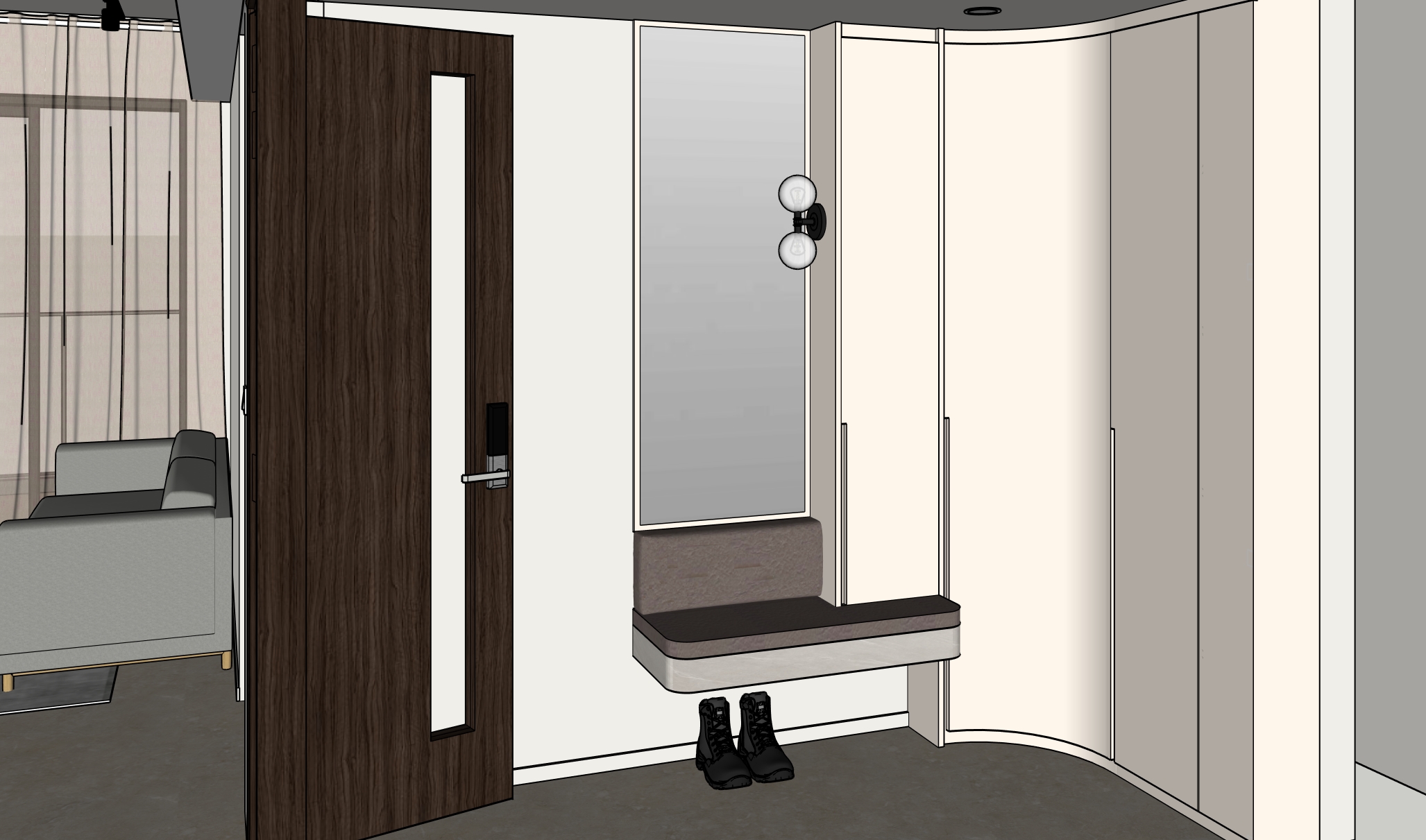 colours and texture to remain accurate as per original picture floor in light beige tiles full height cabinet in matte off cream colour cushion in muted mid grey leather