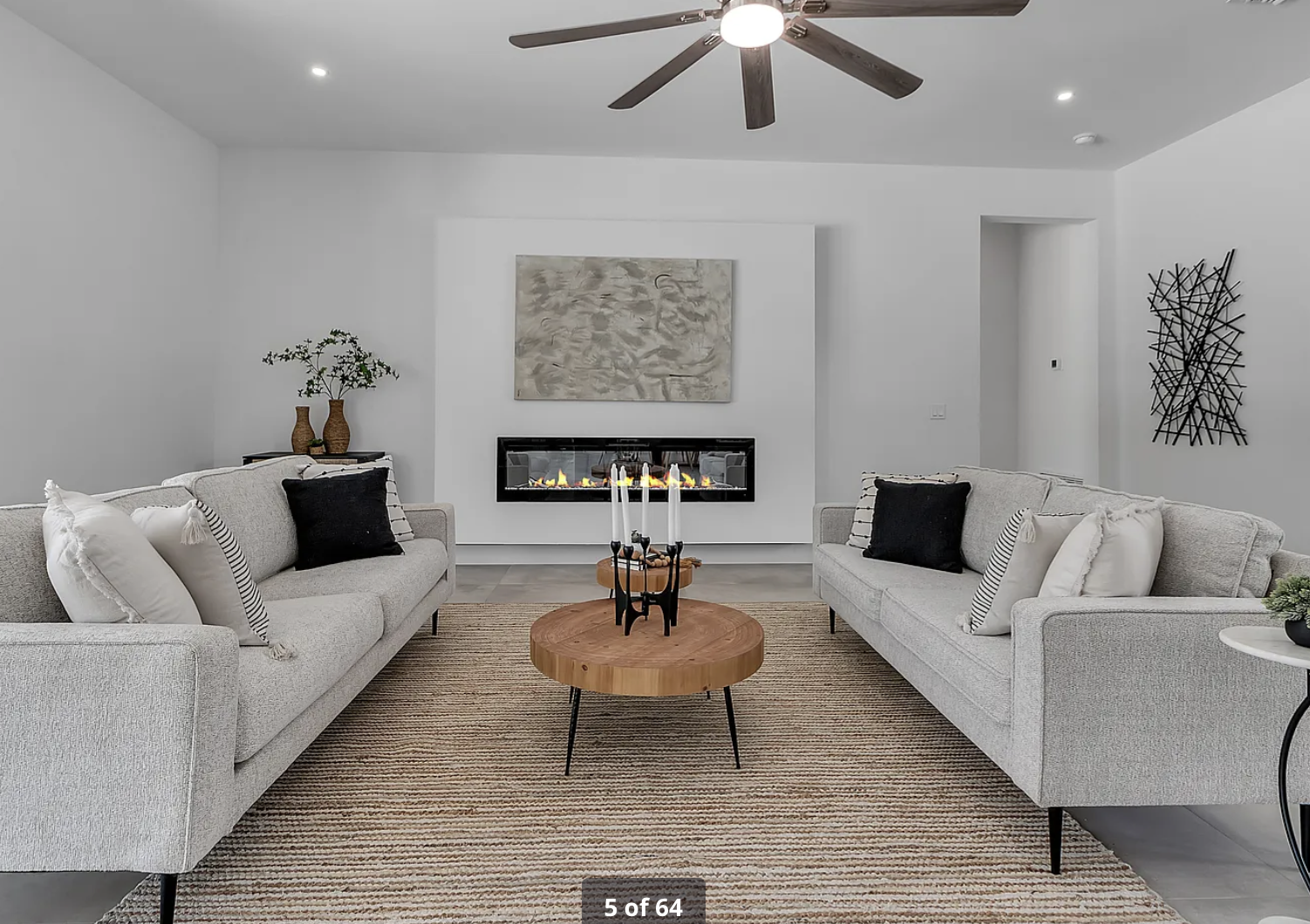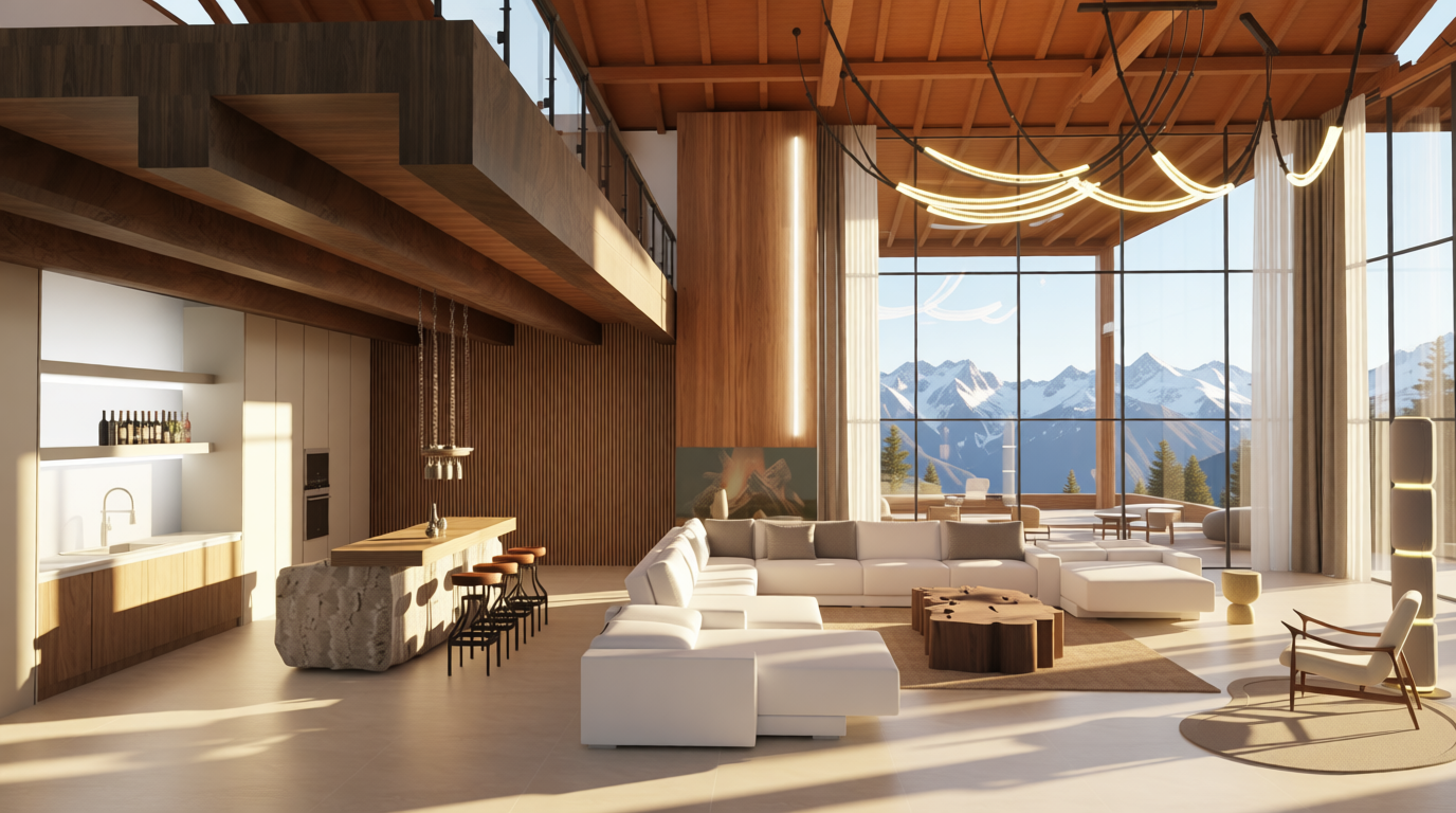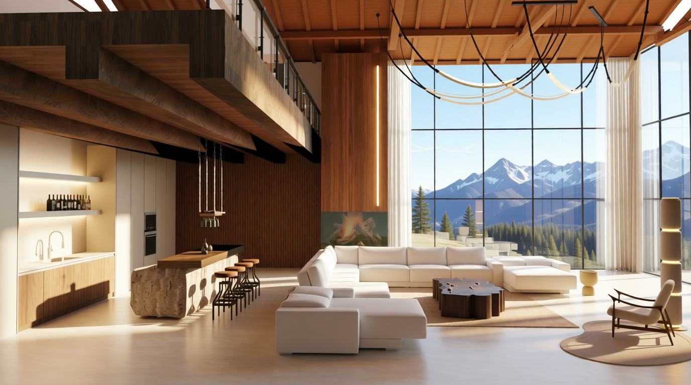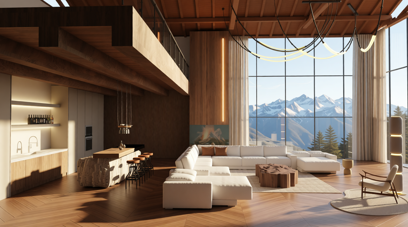 replace existing fireplace wall finish with warm faux wood plank paneling in medium brown tone horizontal wood slat pattern with subtle grain texture modern contemporary aesthetic photorealistic interior natural lighting