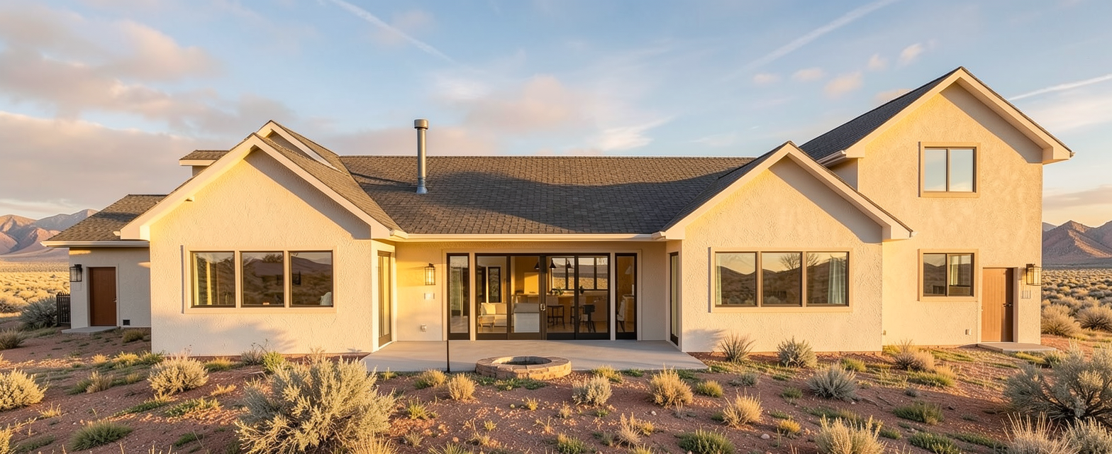 in the distance above the pond back by the pine trees a single story home at center flanked to the right by a garage building and to the left by a two story residential home the compound is connected by covered breezeways the style is scandinavian and the exterior is clad in vertical cedar siding with lots of glass windows there are rustic modern architectural elements the single story home in the center should reference the image attached the barn parking garage at the right should also be single story