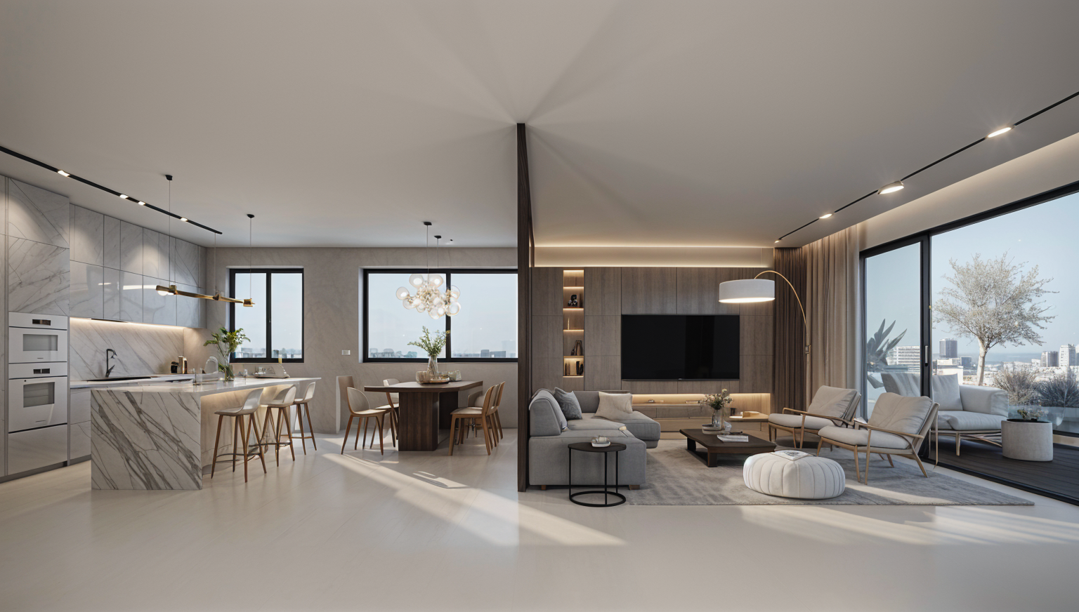 bauhaus perspective shot in the living room infront of the tv their is a coffee table in the kitchen the oven is black out side in the balcony the deck is made out of brown wood and the plants are green and alive architecture