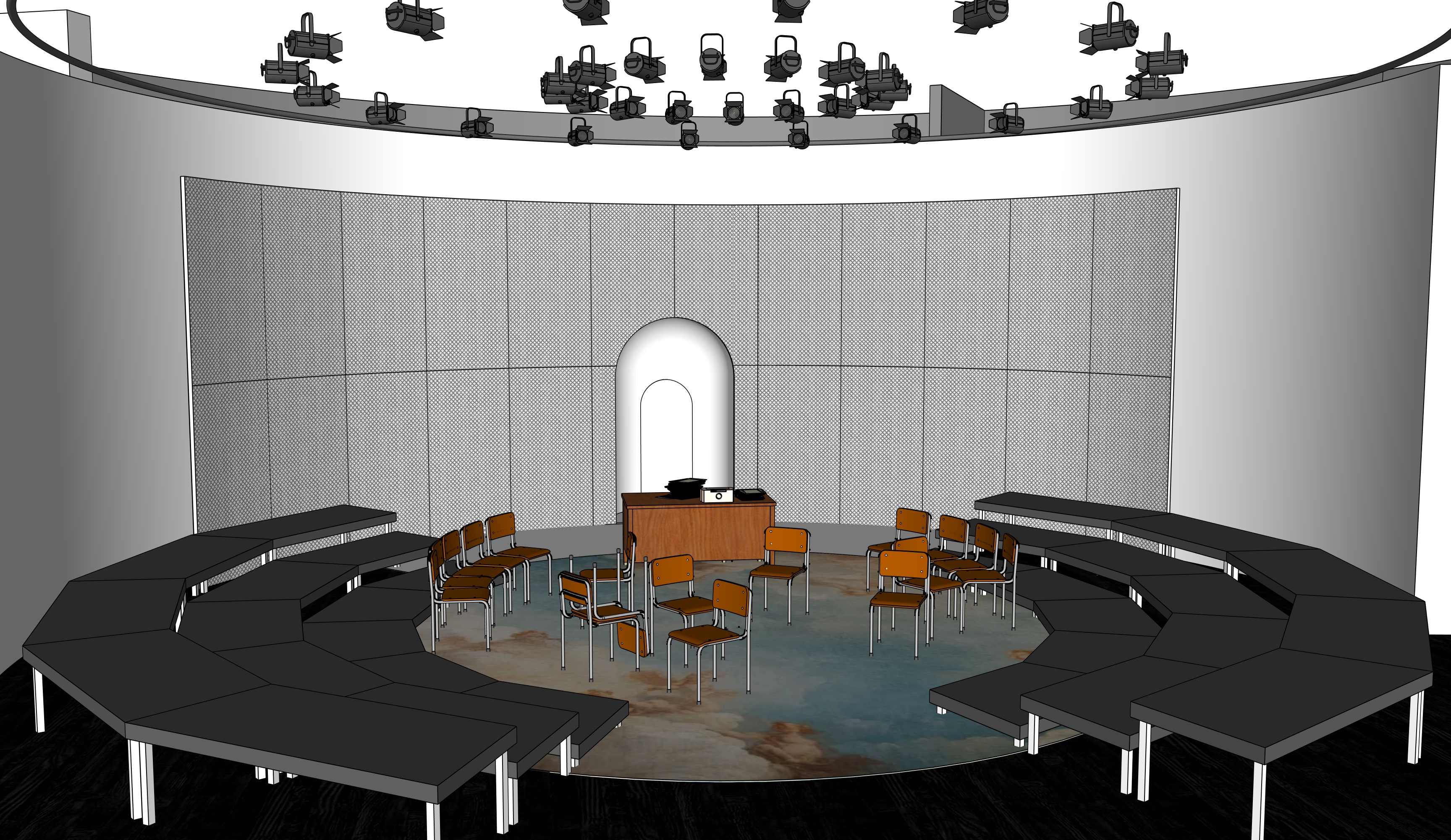 interior shot add dramatic top beam light put light in all the spot lights this is a theater set dramatic shadows