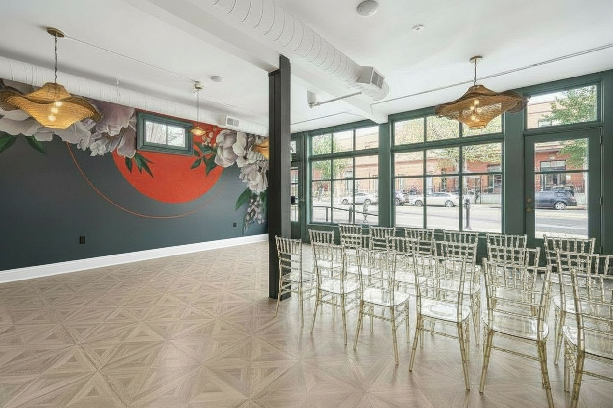 create a wedding venue scene in front of the storefront windows hang swooping off white linens decorate with autumnal flower arrangements and include a gold wedding arch