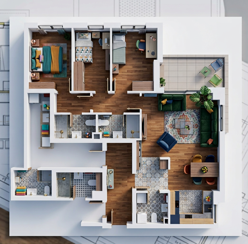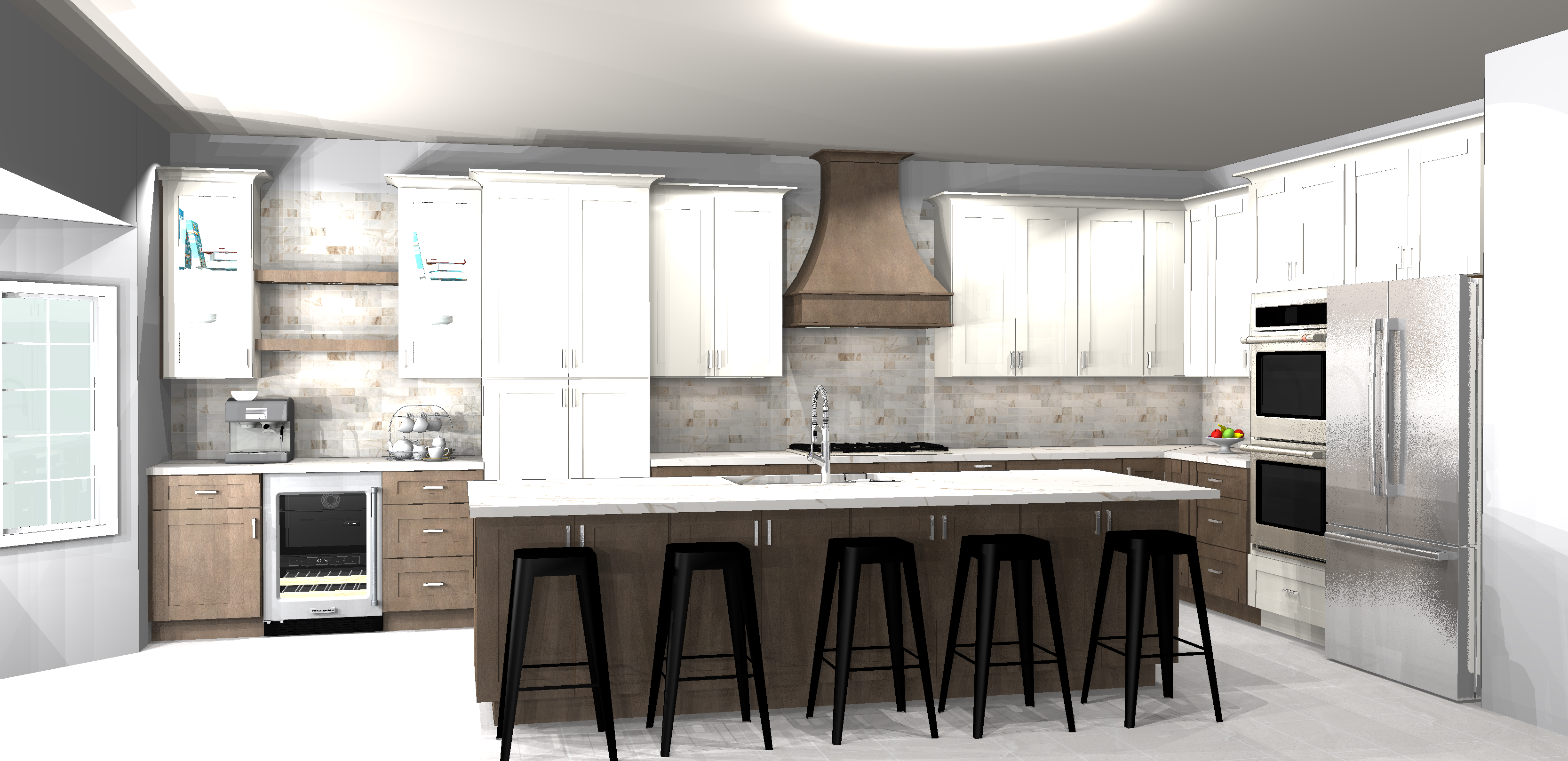 make it realistik keep finishes white and mocha keep layout coffee section has glass wall cabinets do not change it