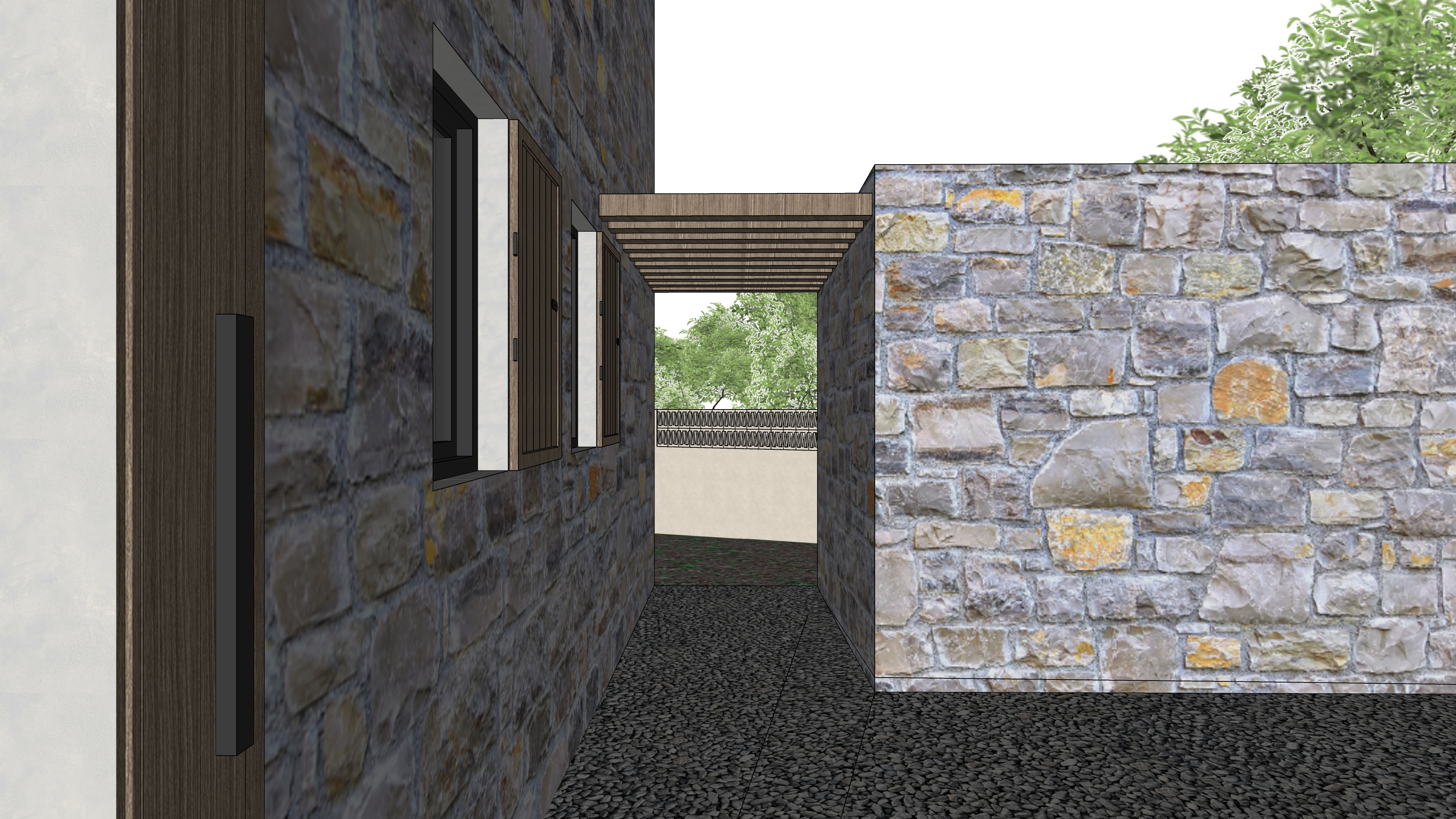 main prompt this is a house in thassos island by the sea the 2 storey volume is made of grey stone the window frames are dark grey and the shutters are medium oak wood negative prompt do not change materials do not change geometry