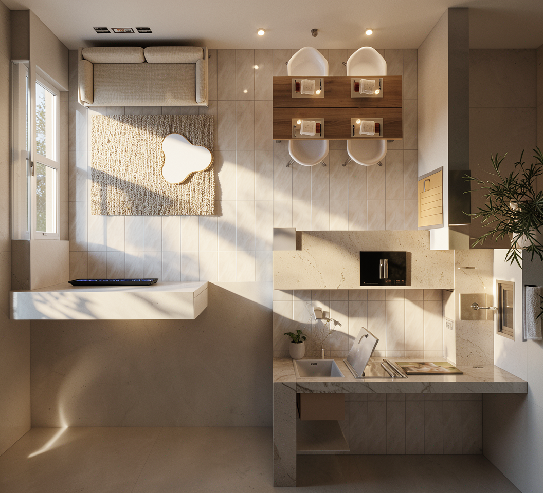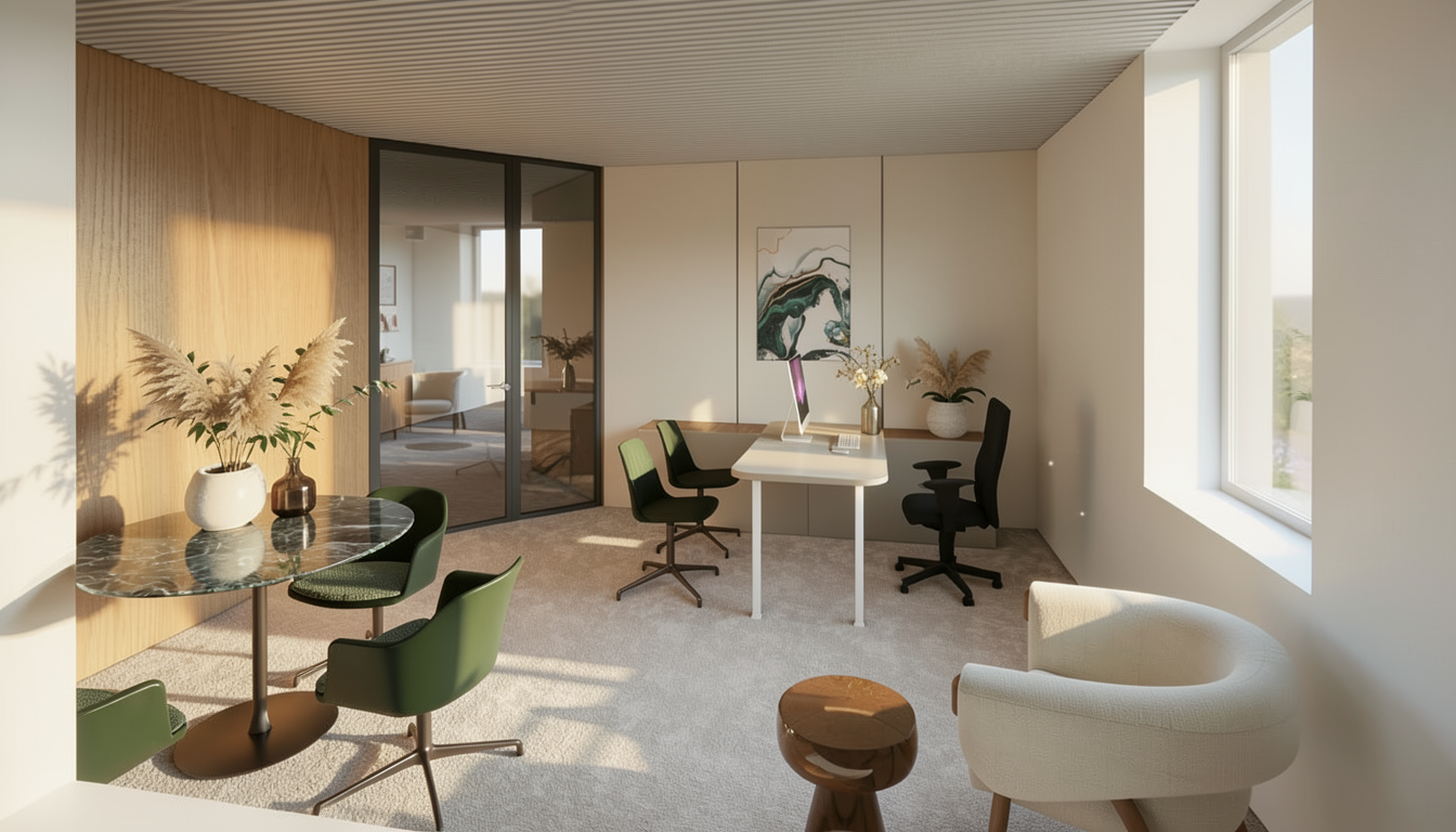 create a more realistic image better ilumination respect materials colors and shapes light carpet floor add some office decoration in tables