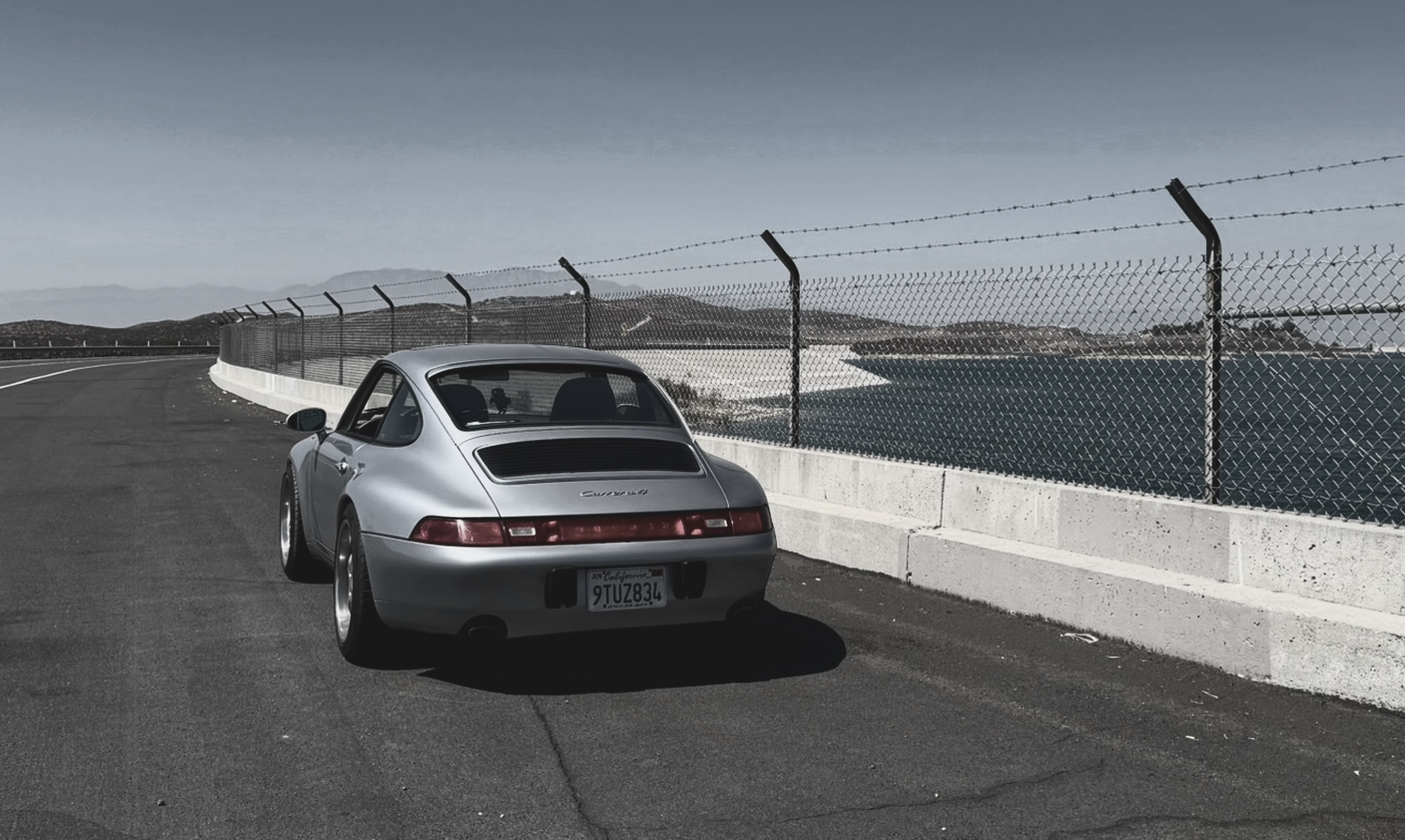 parked on the roadside along the curb remove the chainlink fence and concrete barrier and change to landscape change the background to pacific coast highway with california palm trees and high noon california summer weather