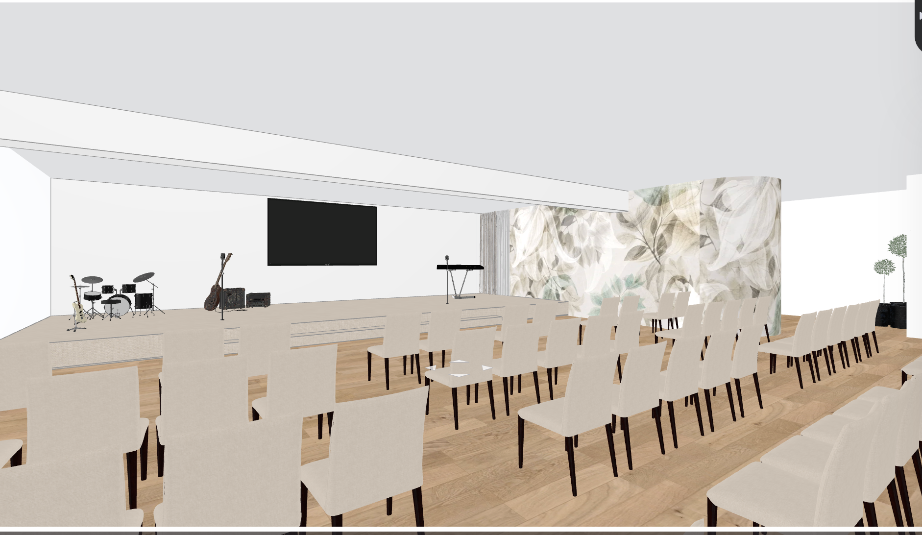 create a highly photorealistic interior render of a modern conference room maintaining exactly the same proportions layout camera angle and architectural structure as in the reference image the space features a curved feature wall at the back of the stage fully covered with an elegant botanical wallpaper in soft neutral tones beige warm ivory muted sage leaves the wallpaper must appear high resolution realistic slightly textured not flat or digitally artificial a raised stage with sand colored carpet same tone as the chairs upholstered conference chairs in a warm sand fabric with subtle texture matte finish soft padded appearance and dark slim legs the stage has integrated linear led lighting running continuously along the lower front edge and along the side steps the led light is warm white 3000k soft glow diffused elegant not too strong creating a refined architectural accent wooden floor in natural oak tone slightly warm realistic wood grain lighting natural diffused daylight entering from unseen side windows soft ambient lighting with realistic shadows subtle bounce light on the curved wall to enhance depth the led strip lighting must create a soft luminous line defining the stage perimeter materials must look physically accurate visible textile texture on chairs slight pile texture on the carpet gentle light reflection on wooden floor realistic depth on wallpaper surface camera eye level perspective wide but natural lens no distortion balanced exposure professional architectural photography style ultra high detail cinematic realism no changes to layout no object repositioning no added decorative elements