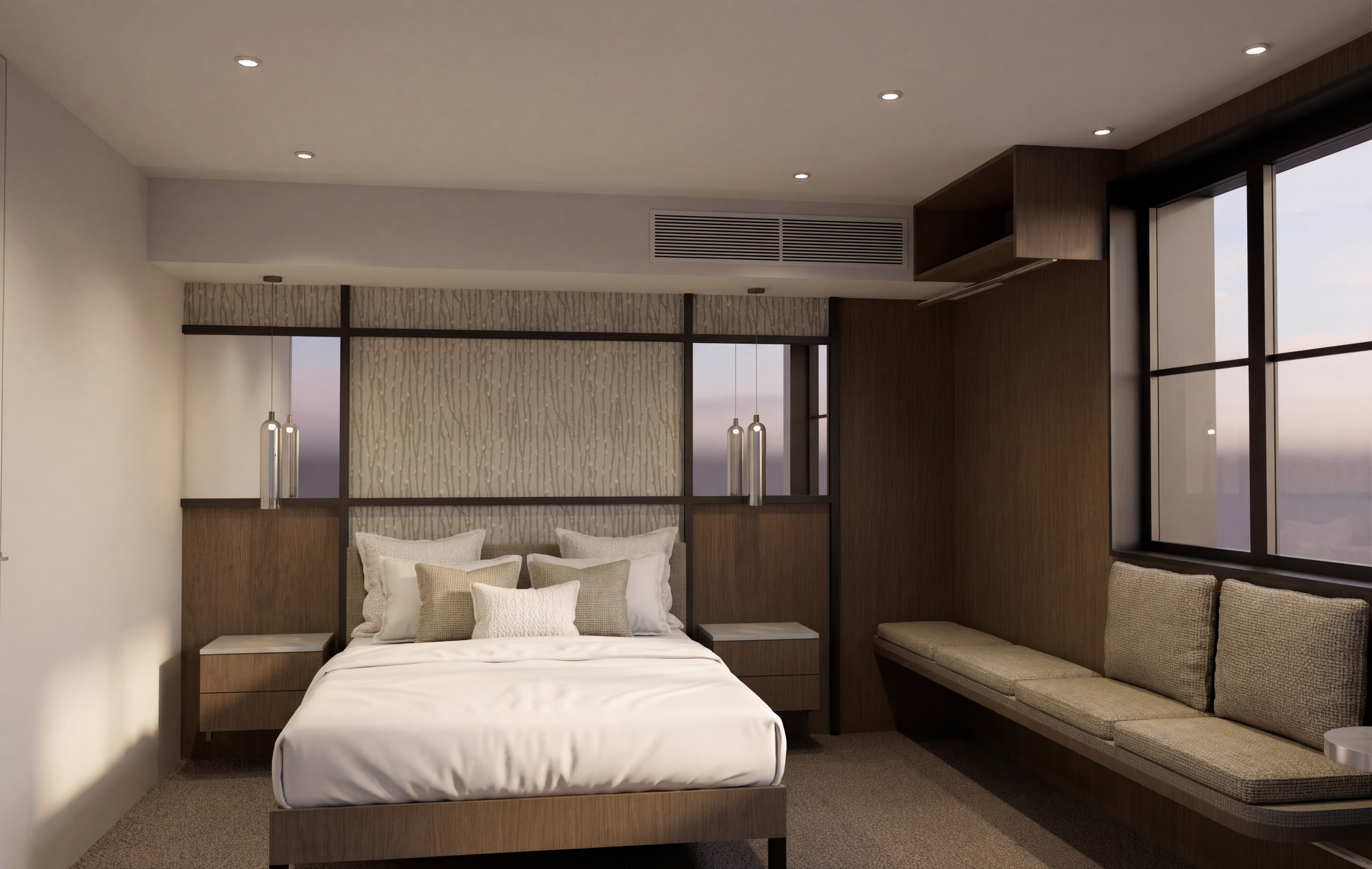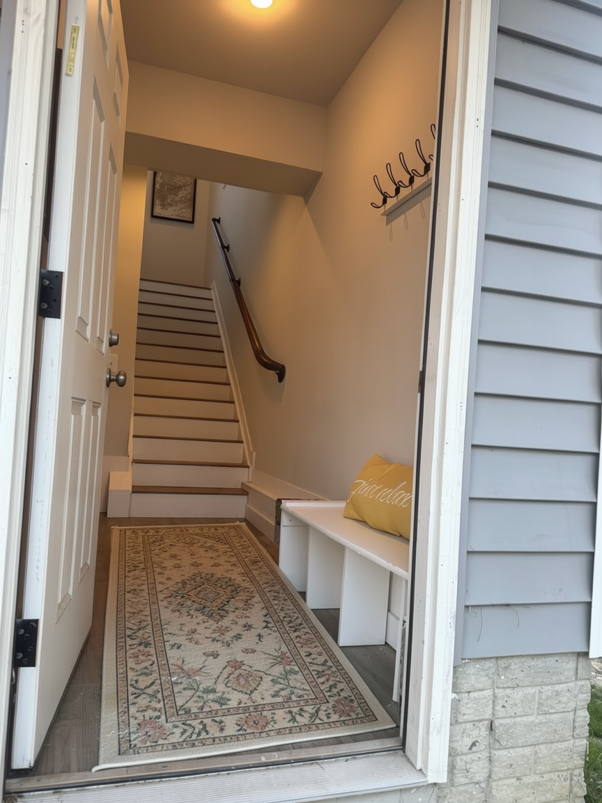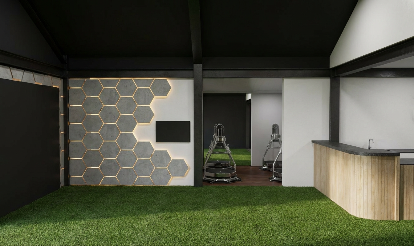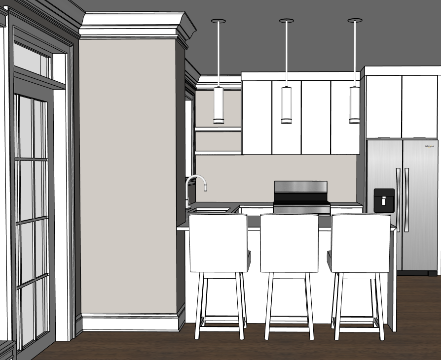 modernist interior shot white box aside from floors and appliances greenery through window architecture