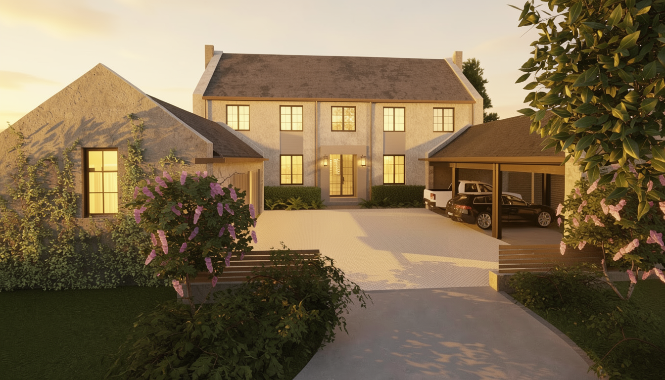 make the house window frames black smaller green mountain in the back remove curtains behind windows