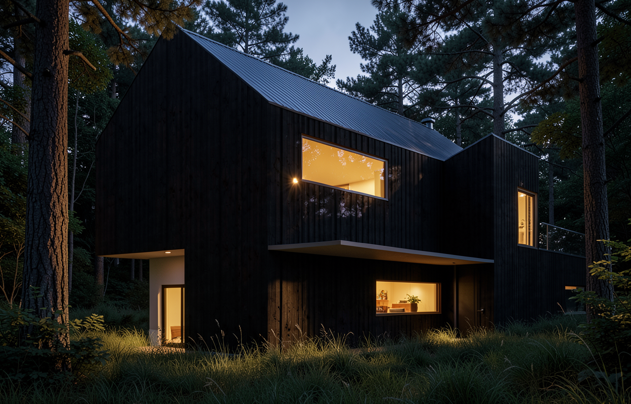 make as photorealistic as possible while keeping textures the same as selection professional landscaping in a lightly wooded scene with good lighting match materials to plan sw6073 perfect greige vertical siding black gutters black windows black trim medium brown brick foundation black roof