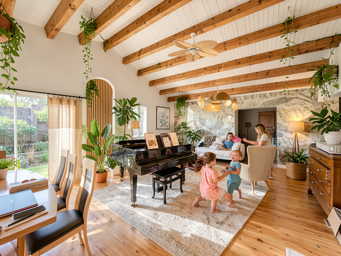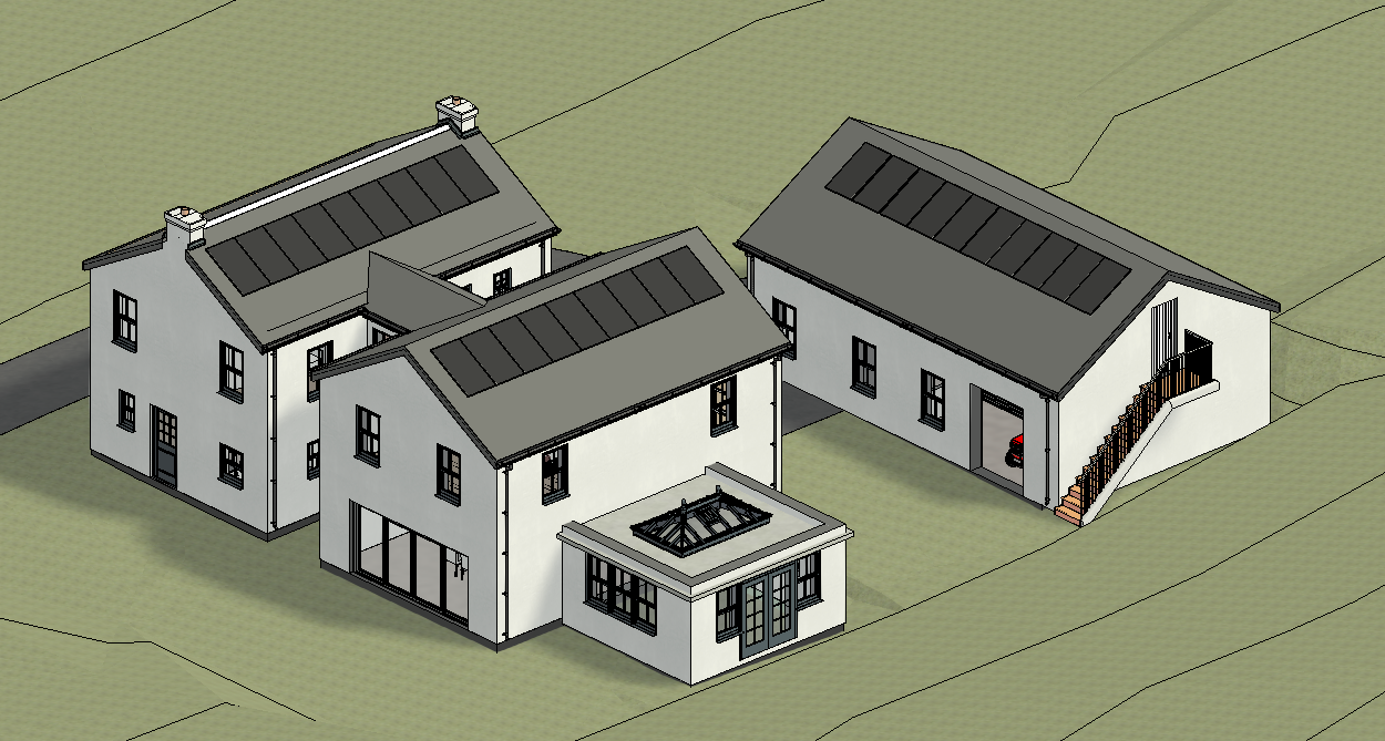 contemporary exterior shot render a beautiful modern country house with white exterior walls and dark gray roofs the window frames are black adding contrast to the structure surround the house with gentle rolling hills in soft olive green creating a serene and picturesque landscape the driveway is a smooth charcoal gray curving gracefully towards the entrance capture a bright and sunny atmosphere with clear blue skies allowing the sunlight to cast soft natural shadows on the building and ground enhancing the inviting and tranquil environment architecture