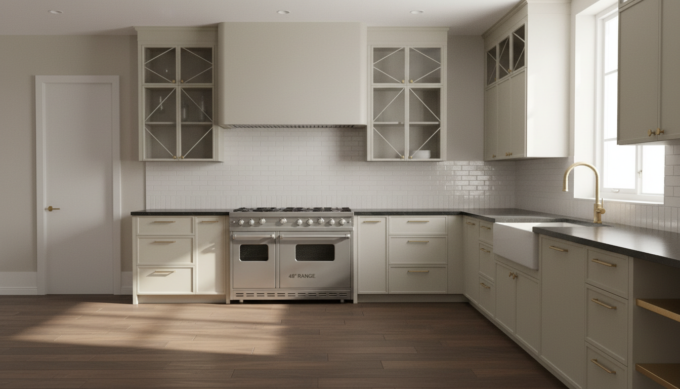 render fotorealistico di una cucina bianca con piastra a induzione sopra una struttura metallica bianca dove si trova un forno a microonde su mensole bianche metalliche ripiano in marmo grigio bardiglio come il tavolo pareti tutte intonacate di bianco luce naturale che entra dalle due portefinestre sulla destra pavimento con parquet in listelli piccoli disposti a scacchiera aggiungi elementi tipici delle cucine ma ordinati e di design sui ripiani