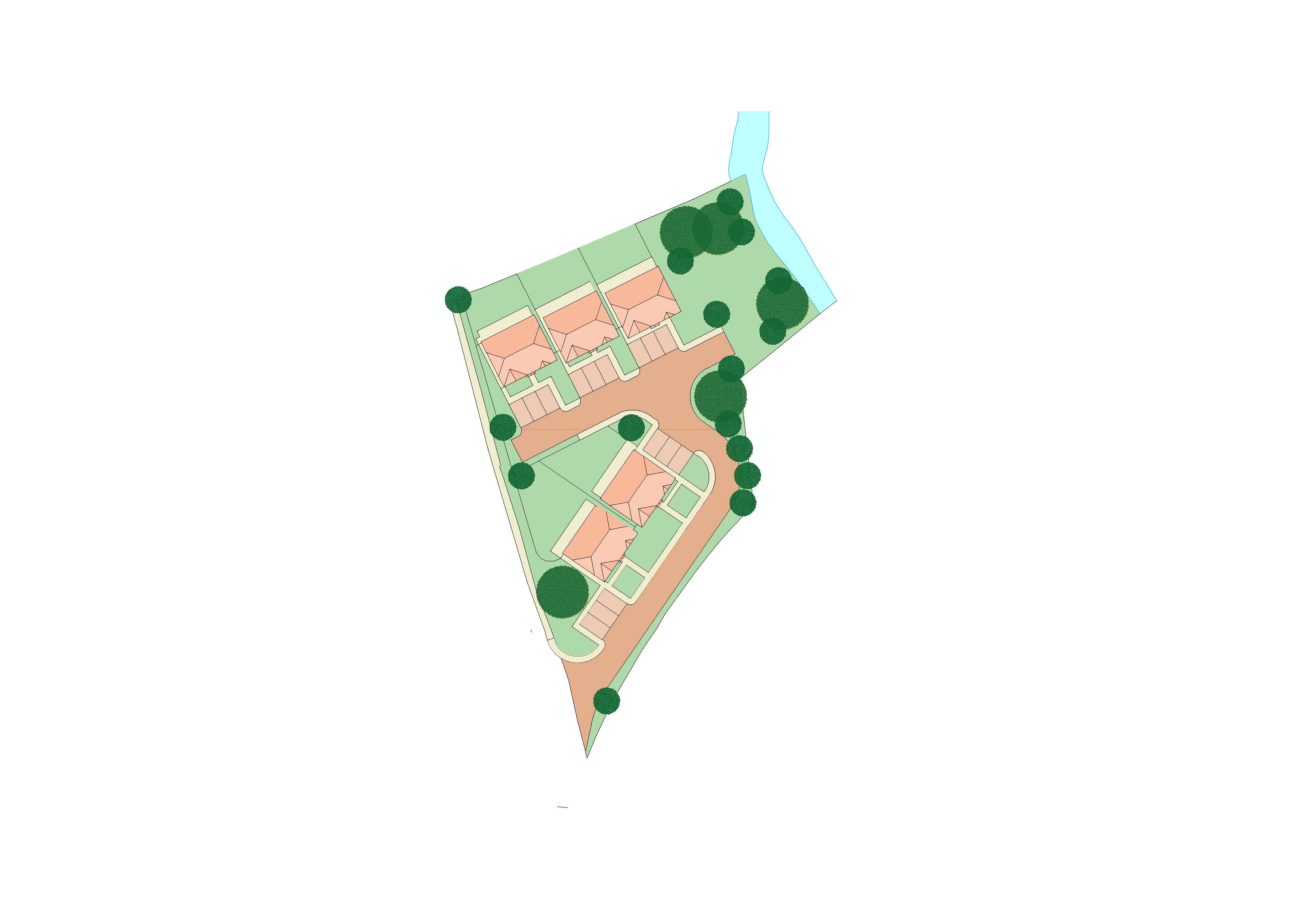 this is a top down site plan no background required render the plan as drawn the blue area is river green in lawn not water no xolour or effects needed outside the drawn extents no shadow outside the drawn extents retain house roofs