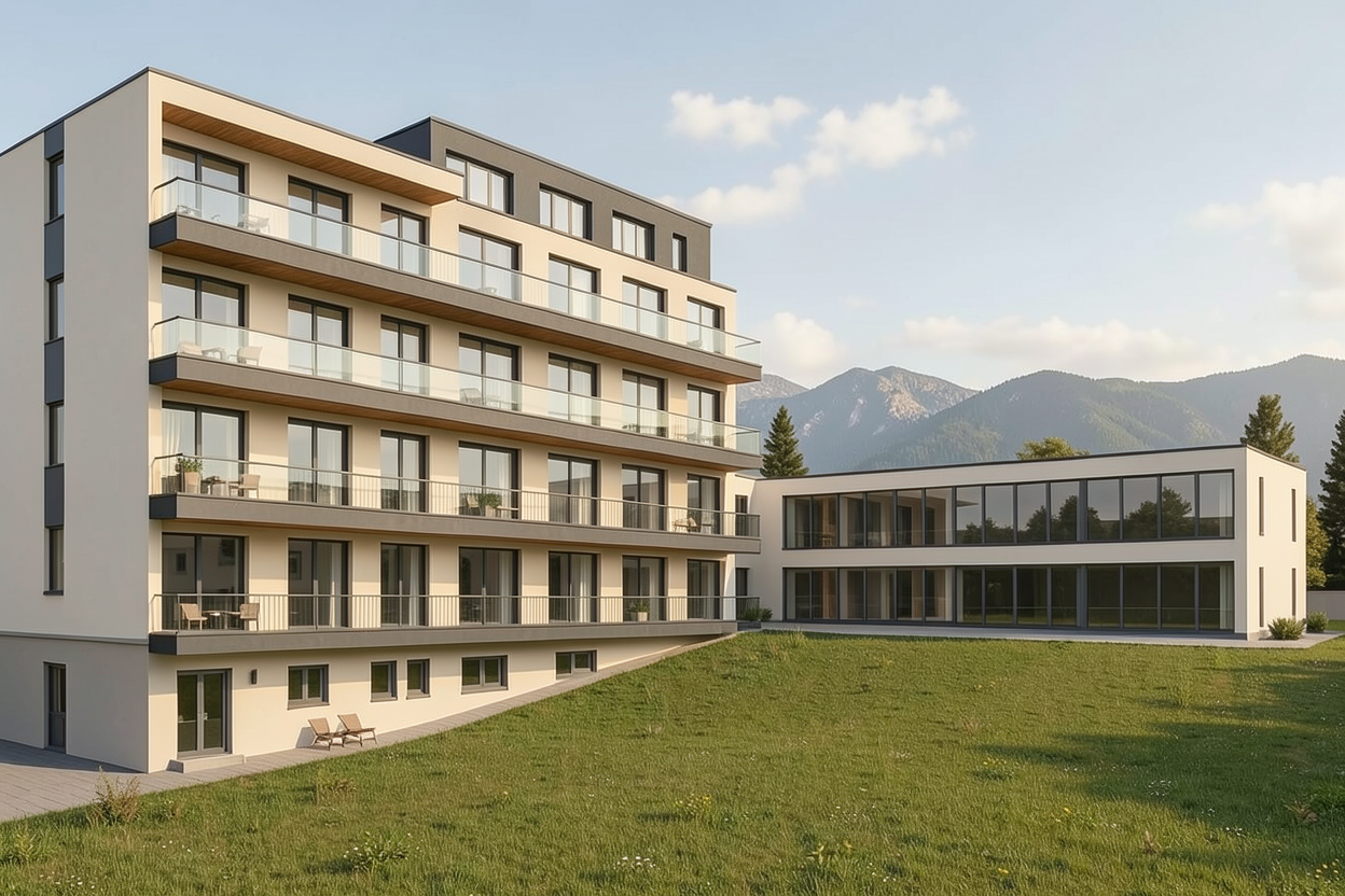 make it ultra realistic facade keep all materials take back fence out add a thin rectangular pool in the middle coming out of the sauna on the right open door side of the house make a cascade waterfall where the plant is on the first floor ceiling on the right side take plant off