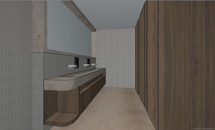 this is an interior render of a commercial workplace interior for a corporate client enhance this base render to a photorealistic level only improve material realism surface texture depth subtle reflections soft shadowing consistent global illumination and minor real world imperfections typical of a completed workplace environment preserve the scene exactly as provided do not alter the camera angle framing layout proportions geometry finishes furniture placement or spatial relationships do not add remove replace redesign or stylise any objects furniture or materials lighting scheme neutral evenly distributed ambient workplace lighting no visible light direction no daylight casting no sun patches glow shafts or highlights suggesting light entering the space lighting should feel understated diffuse and functional similar to real commercial office conditions maintain realistic interior exposure with restrained brightness and soft tonal variation avoid bright whites dramatic contrast or stylised lighting effects do not introduce additional lighting elements or mood maintain the original architectural design intent focusing strictly on realism clarity and accuracy suitable for professional commercial client presentation lighting scheme the space is lit by downlights and an led strip light originating from the perimeter of the mirror under interior conditions lighting should remain in character with a restrained and realistic exposure level and no visible directionality daylight casting glow or highlights beyond what is explicitly described the intent is for the lighting to read as natural and appropriate for a real commercial interior without any added lighting effects or reinterpretation