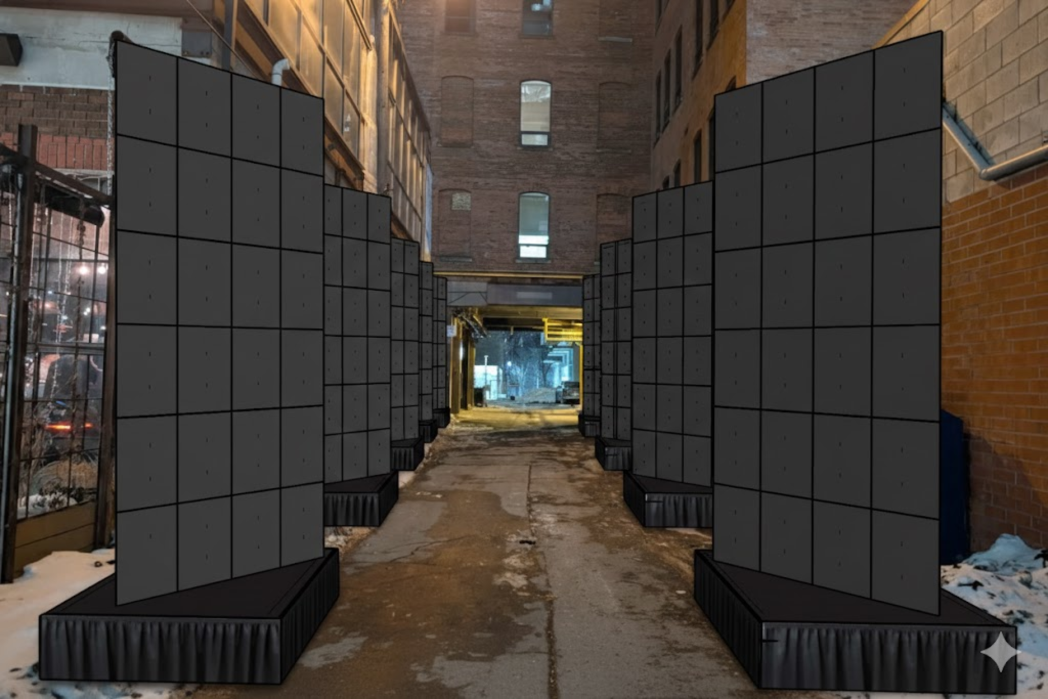 le corbusier exterior shot night time cinematic urban alley scene between tall brick buildings keep the exact camera angle and composition snow along the edges wet pavement reflecting light replace the flat grey panels with tall modular led video walls on both sides of the alley arranged in rows on black skirted stage bases the screens are powered off completely black glossy slightly reflective visible led panel seams and mounting hardware lighting is dramatic and moody add cool blue ambient moonlight from above soft haze in the air subtle volumetric light beams from distant streetlights at the far end of the alley warm practical light spilling from a few windows in the brick buildings for contrast reflections of windows and distant lights visible on the glossy black led surfaces and wet ground add light atmospheric fog faint breath vapor in the cold air and subtle depth falloff toward the background keep it realistic high detail cinematic contrast shallow depth of field 16 9 ultra sharp photoreal no people no cars no signage no text on screens screens must remain off and black architecture