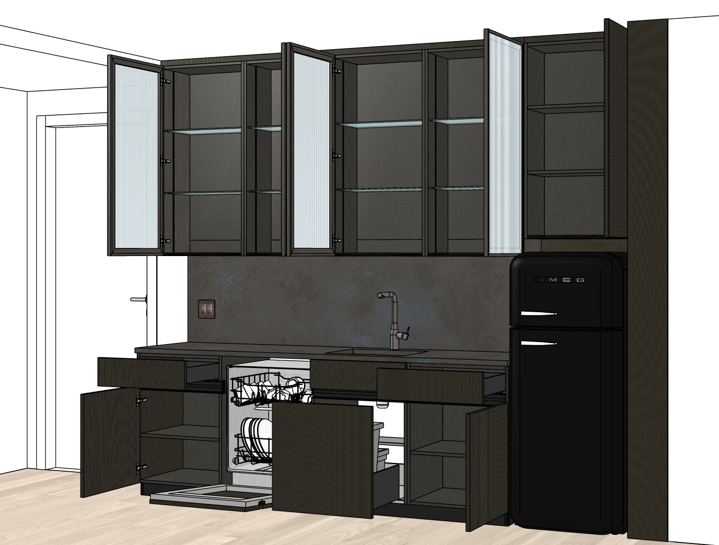keep the original finishes no shelves lights no strip lights no led lights no cabinets lights the door on the wall is solid white