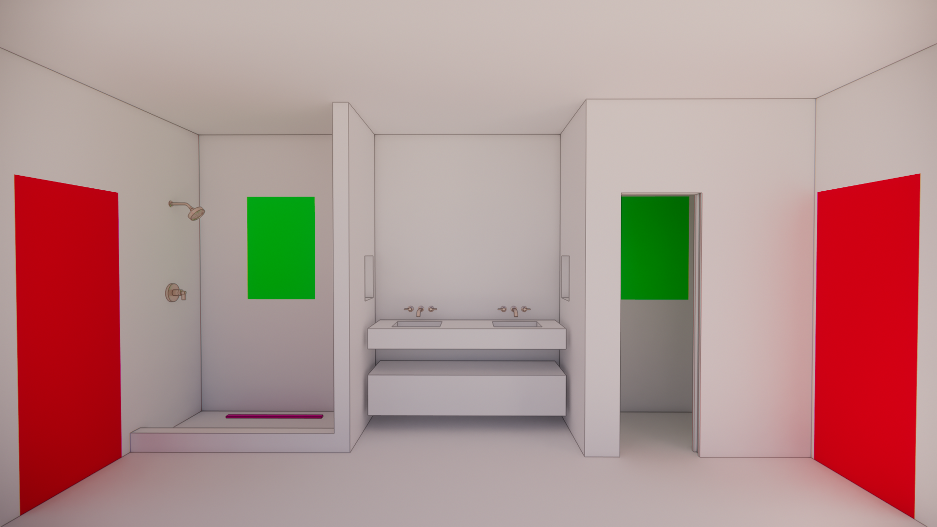 create a white block rendering of this space do not change the layout scale proportions or placement of anything keep all walls openings and elements exactly as shown keep everything white except the highlighted areas windows green the green highlighted areas represent windows replace them with white windows with simple molding trim do not change the size shape or placement put a tress behind the windows doors red the red highlighted areas represent doors replace them with white doors with molding trim the doors on the right and left walls do not change placement do not change the size shape or placement leave everything else as a clean white block model