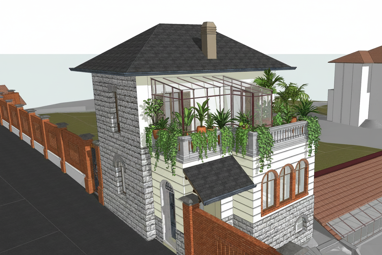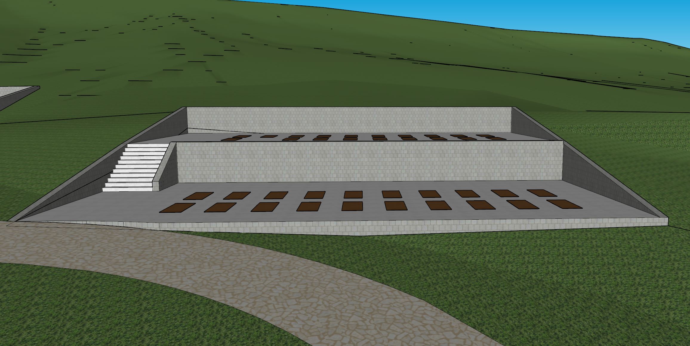 modernist exterior shot convert this screenshot into a hyper realistic architectural render of a two level outdoor yoga platform in a dense metropolitan forest preserve exactly the geometry of the two concrete levels their heights the retaining walls and the staircase do not alter their shape slope or alignment the brown rectangles on both platforms must be interpreted as yoga mats they are individual yoga mats made of natural woven fibers warm earthy tones slightly textured keep the exact same orientation spacing and proportions as in the screenshot they are not wood planks or floor tiles replace the surroundings with a dense native forest consisting of tall slender trees with properly scaled trunks not oversized abundant ferns shrubs tall grasses ground cover and moderately wild undergrowth following the natural slope around the platforms use light grey textured architectural concrete for the platforms stairs and retaining walls the walkway in the foreground must become a rustic stone paved path empedrado with irregular stones embedded in the soil it is very important to maintain the exact orientation curvature and location of the walkway do not rotate shift or modify its path only enhance its material realism lighting bright daytime light mid morning soft and natural ensuring full visibility of the platforms despite the dense forest light should filter through the canopy creating soft shadows and a fresh vibrant ambience style ultra realistic editorial aesthetic consistent with the previously generated zumba image high detail in vegetation materials atmosphere and shadows maintain the original camera angle no people architecture