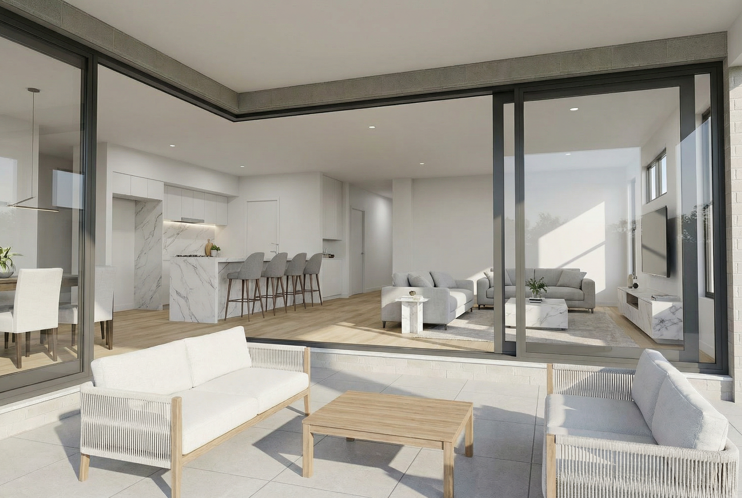 convert this floor plan into a realistic isometric 3d view of a full house show the space from an elevated angle with furniture walls and details visible do not add any rooms or items that are not shown on image back wall in garage has refrigerator and high top table use the same furniture as shows on the plan do not change the orientation of the floorplan