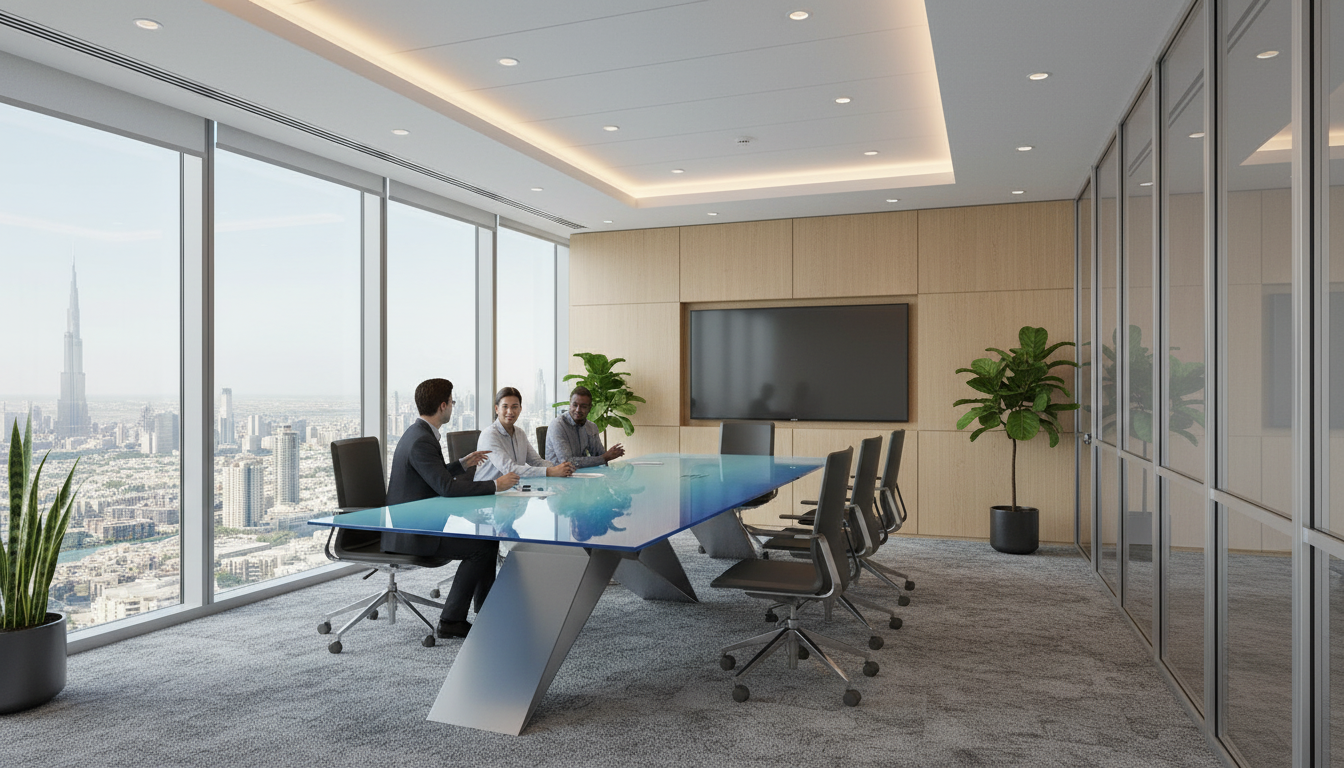 evening sunset view with moonlight shining over the landscape and distant hills recessed lights on above from the ceiling lights turned on the chandelier above the dining table add a floral arrangement on the dining table and plates silverware and wine glasses also on the dining room table add two people sitting on the sofa add books and accessories to the shelves on the left side of the view add similar books and accessories to the shelving cabinet on the right side of the view add a man and a woman standing out side on the balcony facing out towards the hills beyond add a woman walking out of the kitchen beyond the dining table