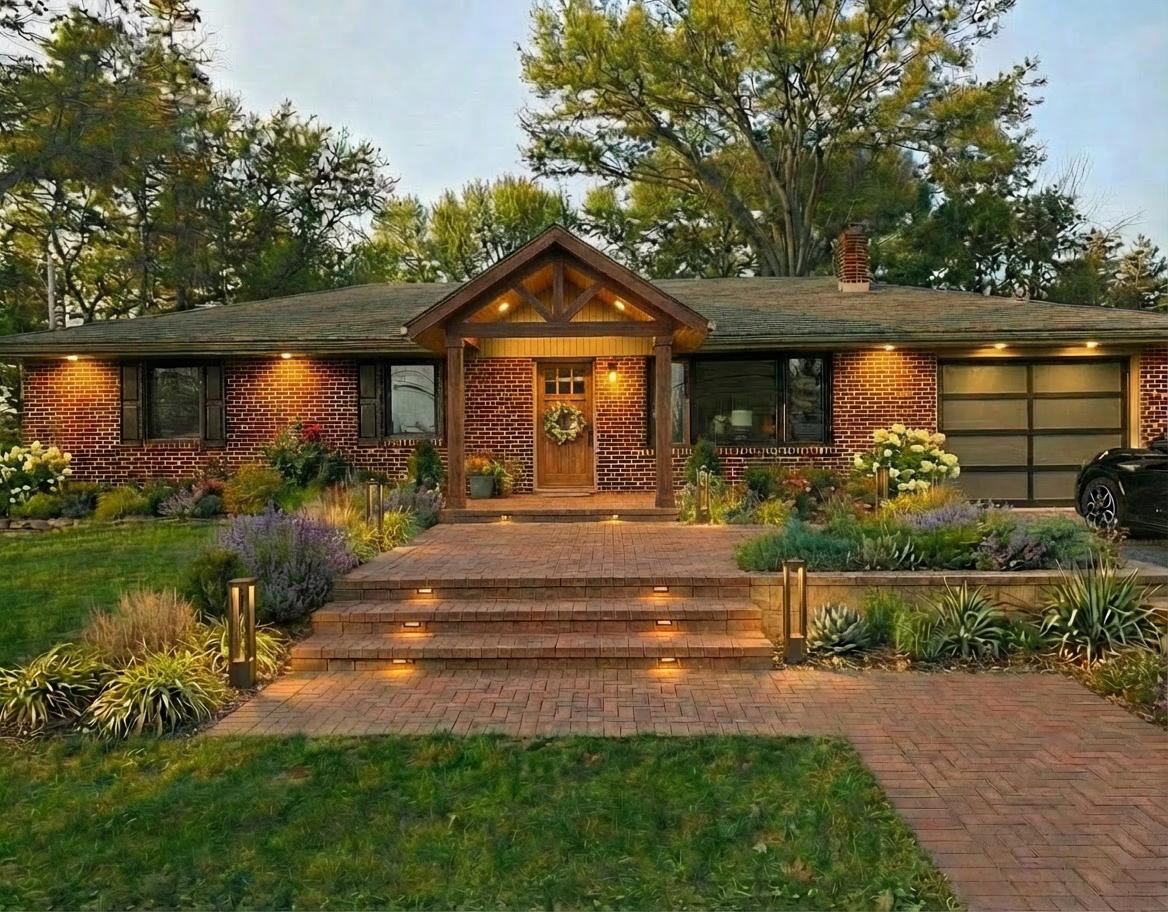 absolute rule keep all house geometry windows exactly as they are as single casements doors roof front step and sidewalk vertical landscape lights and garage exactly as in the photo only change the finish only of the front porch to be more of a rustic brown finish