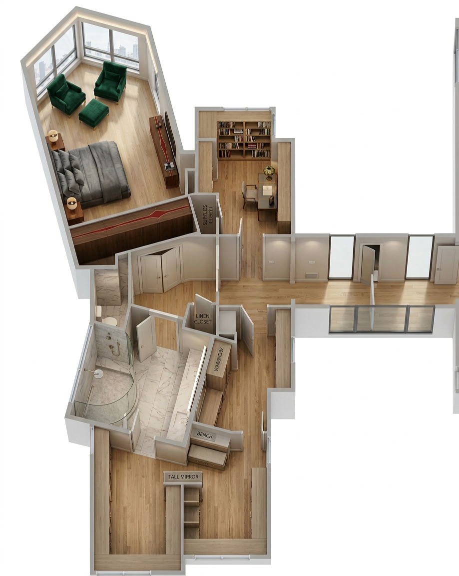zaha hadid interior from the top create a vibrant architectural rendering of a modern residence floor plan with a serene and welcoming atmosphere use a soft cream color for the walls to create a warm and inviting feel apply a rich hardwood texture with chestnut hues for the flooring for the furniture utilize deep blue and gray tones to add contrast and sophistication incorporate lush greenery in the outdoor areas and along the pathway for a fresh and natural aesthetic the overall atmosphere should be peaceful and harmonious showcasing a blend of contemporary elegance and comfortable living architecture