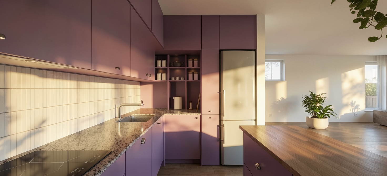 render a stylish music room with a cozy and modern atmosphere feature a set of vibrant guitars hanging on a deep burgundy wall ranging in colors from sunburst orange to deep mahogany place a sleek black shelf against a wall with bold abstract purple and white zebra patterns include a small retro orange lamp on the shelf illuminating vinyl records and a potted plant in a matte black pot add plush navy blue chairs and a classic amplifier with a fabric grille highlight the drum set with gold cymbals soft ambient lighting enhances the warm and inviting mood