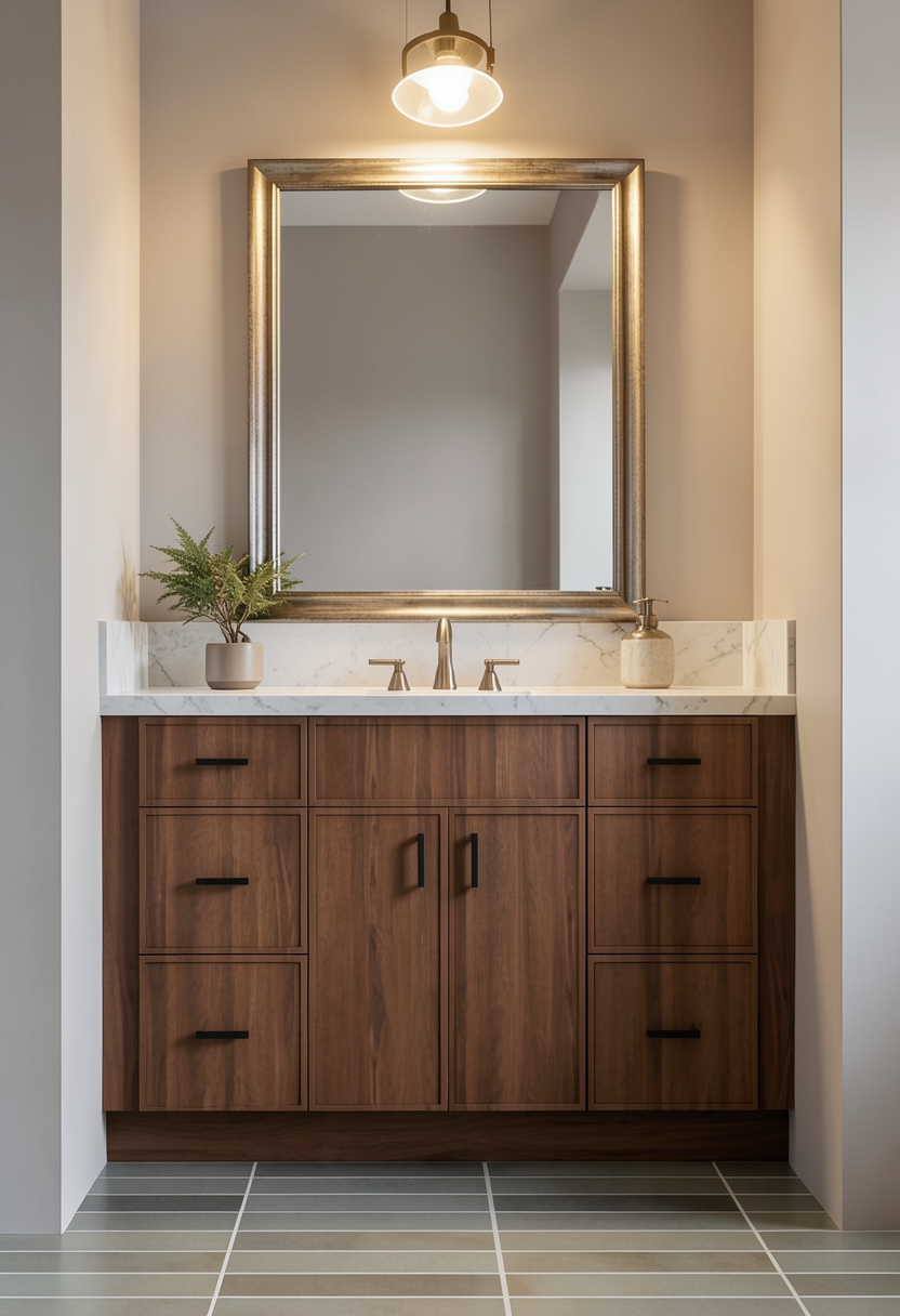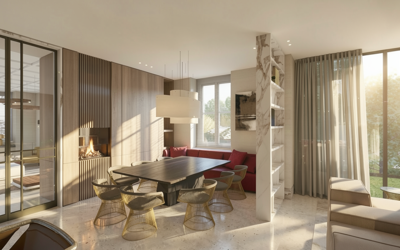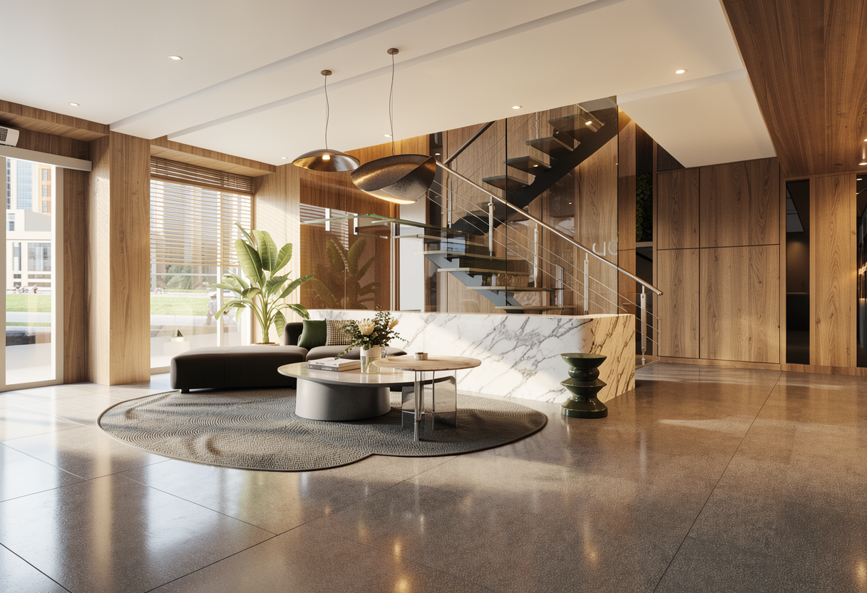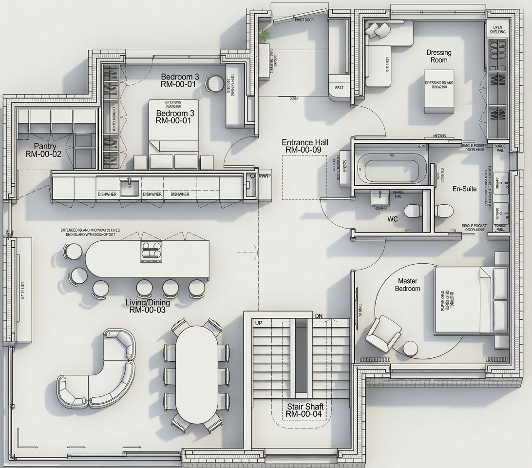 create photo realistic rendering keep geometry textures and colors the same as the input image only glass doors are on the stacked upper cabinets left and right of the hood white grey countertop