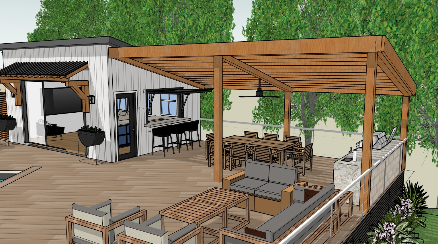 create photorealistic rendering keep geometry white wood siding cedar wood pergola enhance materails and textures location is in lake geneva wisconsin enhance the vegitation in the background