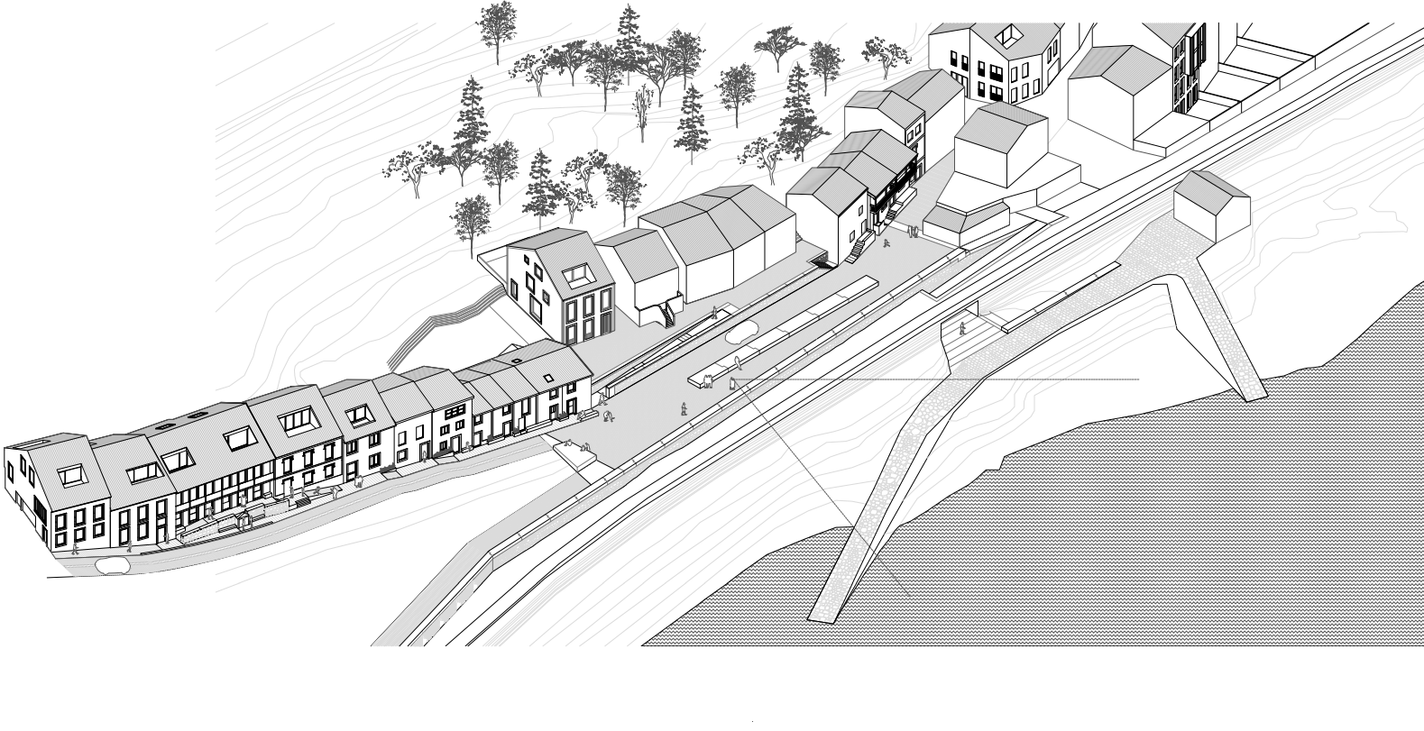 proyecto urbano con viviendas unifamiliares con cubierta de teja en la parte de abajo a la derecha se ve el borde del mar un peque o acantilado hecho con piedras y una rampa para botar barcos hay una plaza de piedra y calles empedradas las casitas son de planta baja y primera con cubiertas con alguna terraza en cubierta en la parte trasera hay una zona ajardinada con rboles en la parte superior izquierda se intuir que hay una carretera con tres carriles en cada sentido parte superior izquierda se ve alg n coche existen plataformas de piedra en las plazas y peque os elementos como escaleras para entrar en algunas casas ambiente gallego