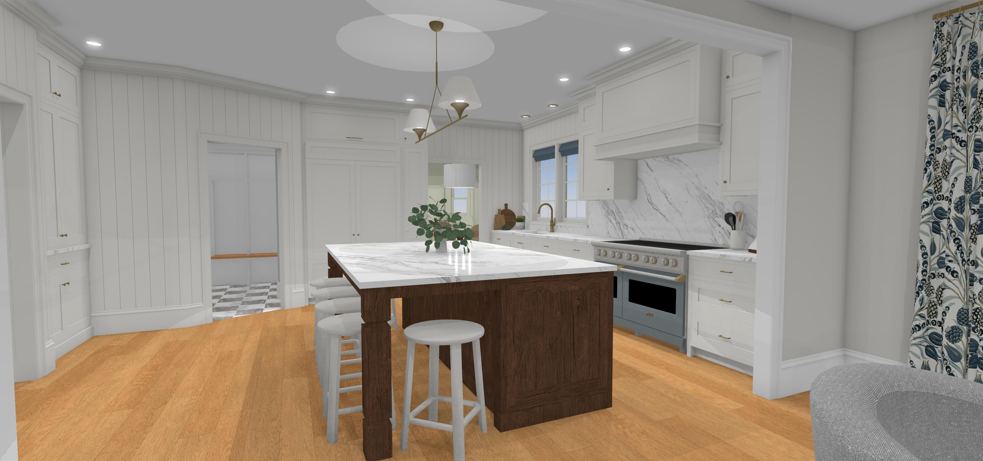 create a photo quality image of this space in the early evening use a soft neutral color benjamin moore edgecomb grey for the cabinetry except for the middle portion which would be soft cut white oak in a light finish use dramatic lighting to highlight the refined nature of this kitchen design