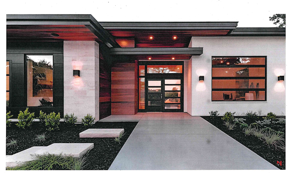 exterior shot lightly wooded lot with a home in the background about twenty feet away autumn colours on trees subtle short very modern landscaping