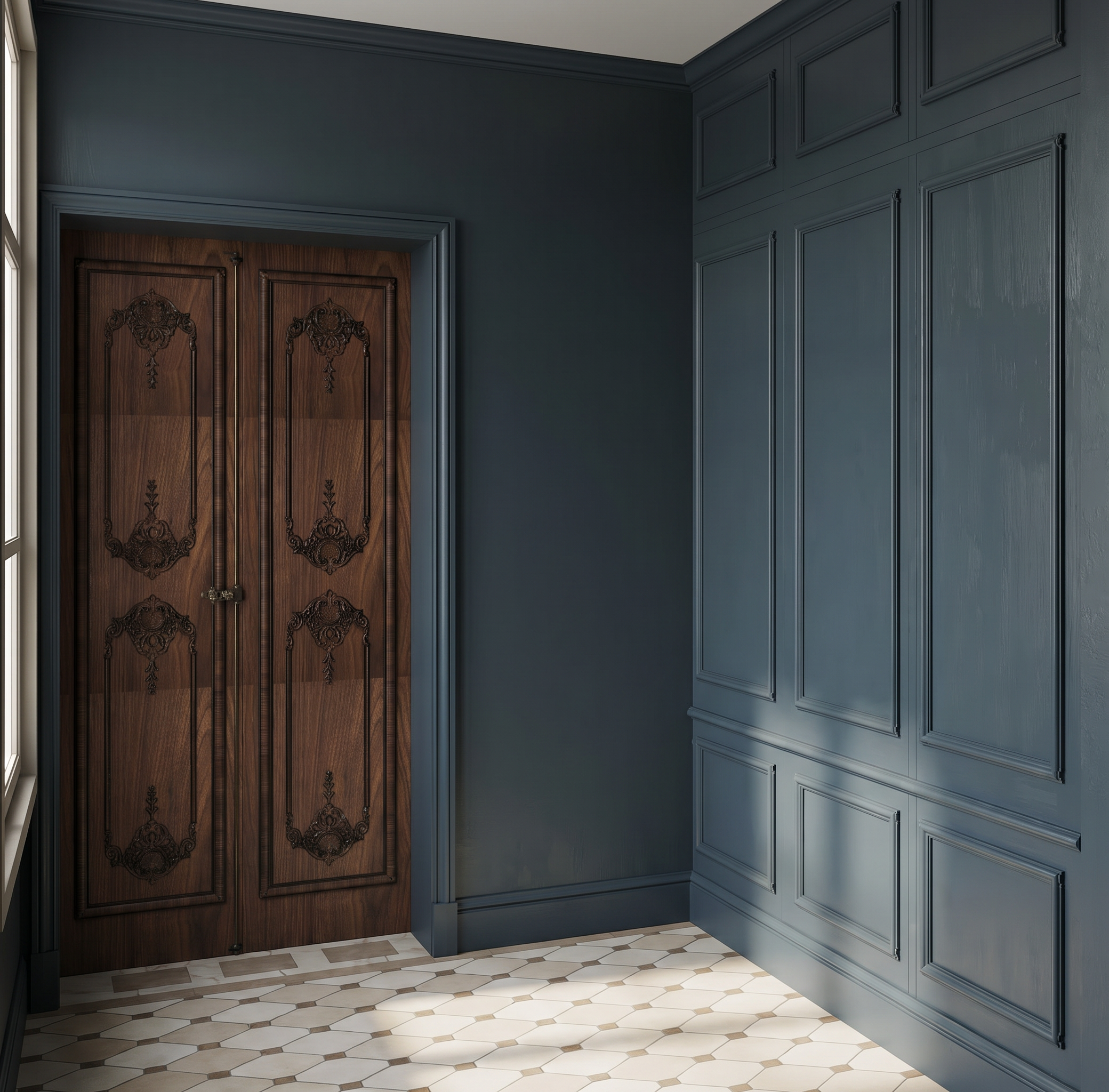this is the main master bedroom of a luxury yacht the floor is dark wood and a beige rug there is a wood skirting but the wall is painted the headboard is wood